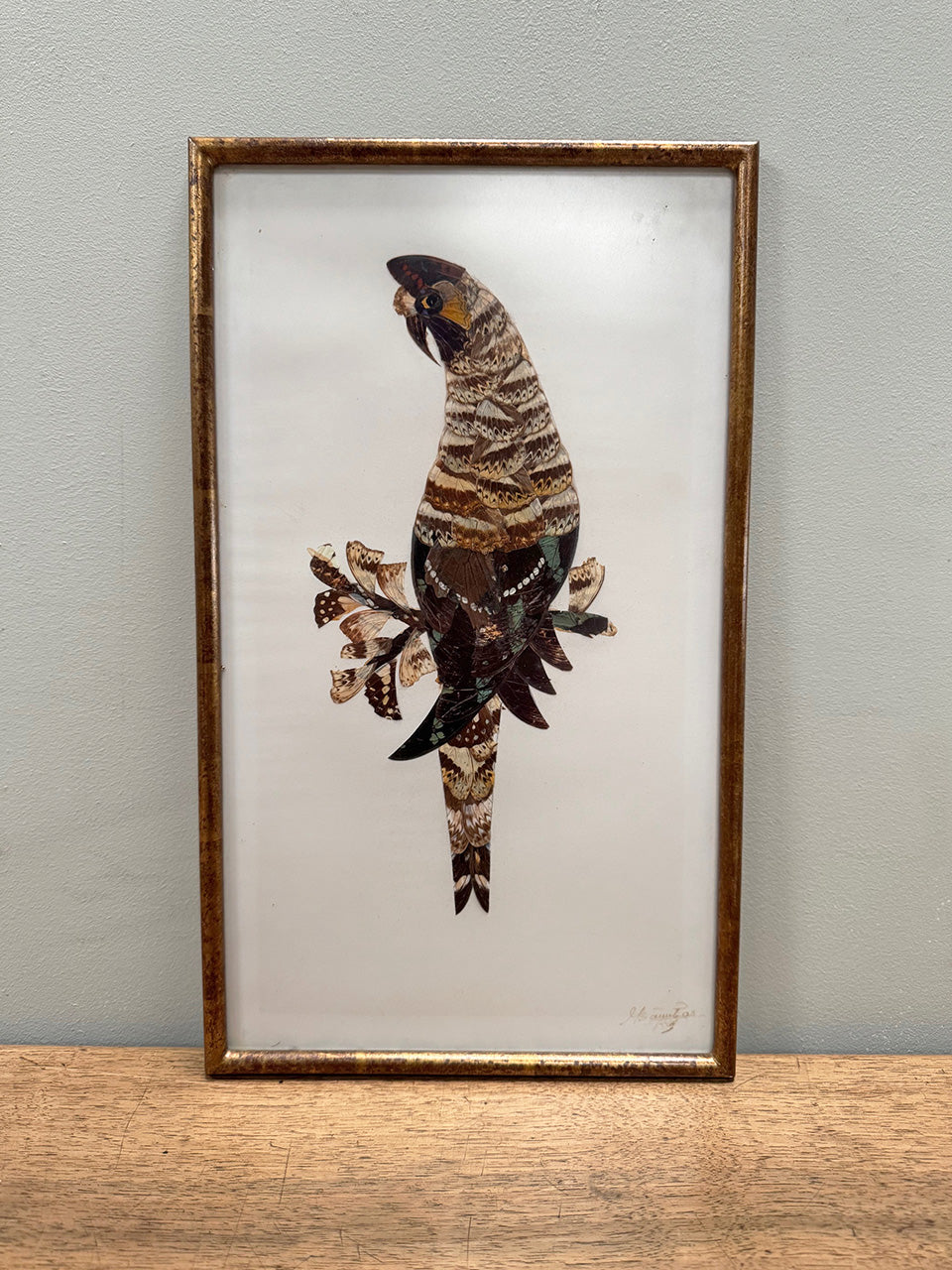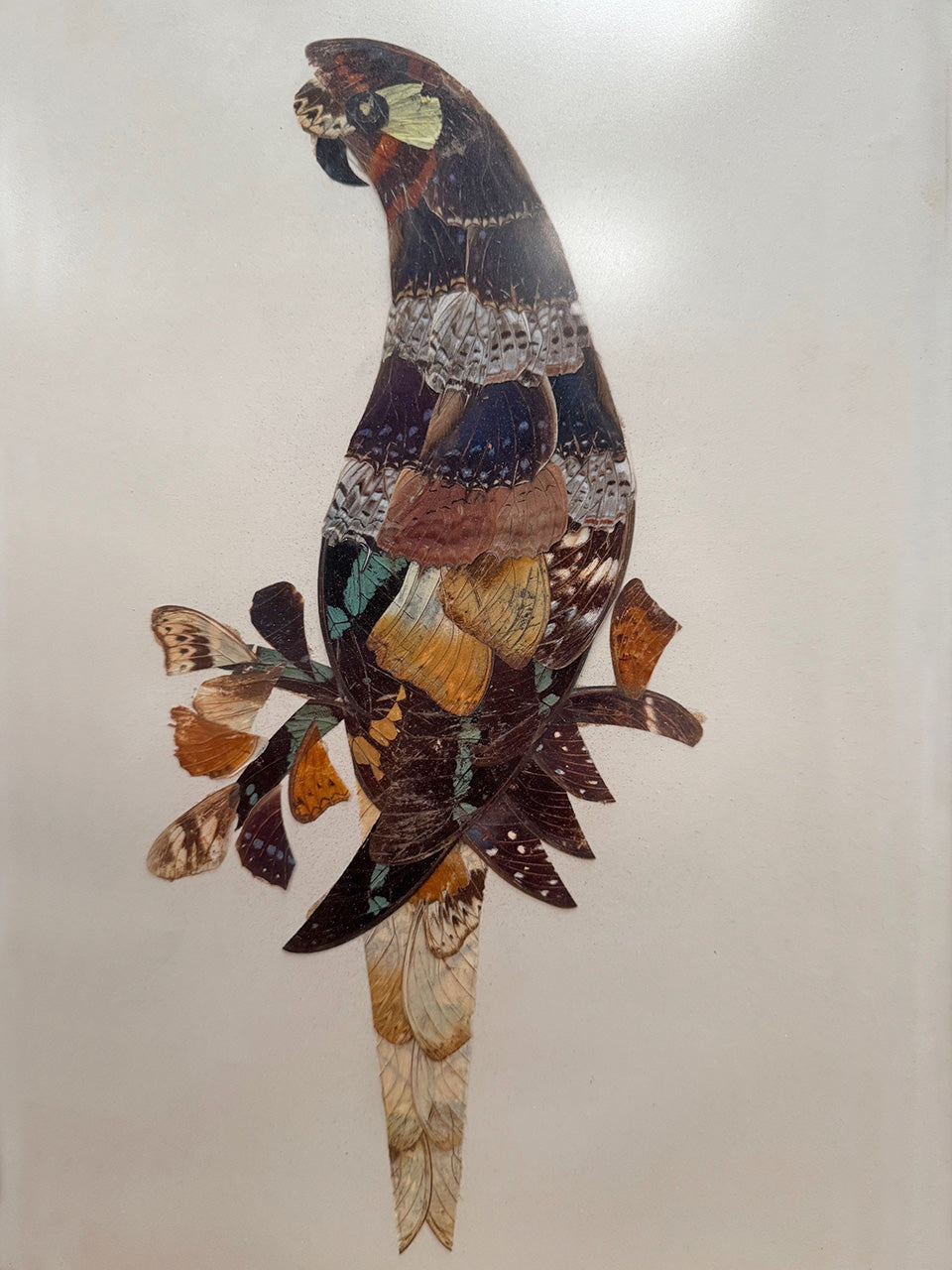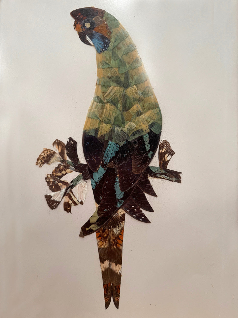 Stunning 1970s collage made from real butterfly wings, delicately set in the shape of parrots, on a blank paper background.