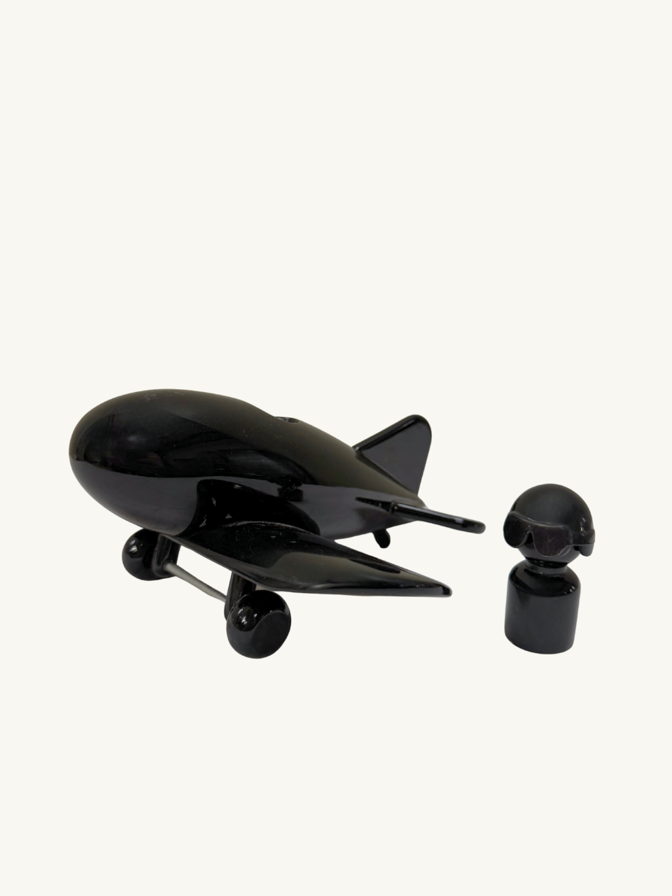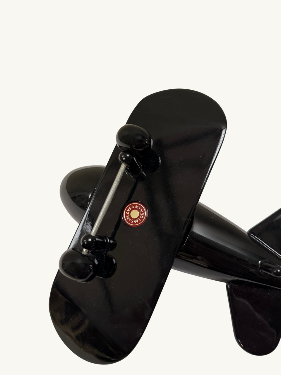A small black lacquered toy plane by Swedish toy manufacturer Playsam. The 'pilot' isn't fixed and can be removed. It has a smooth, glossy finish.