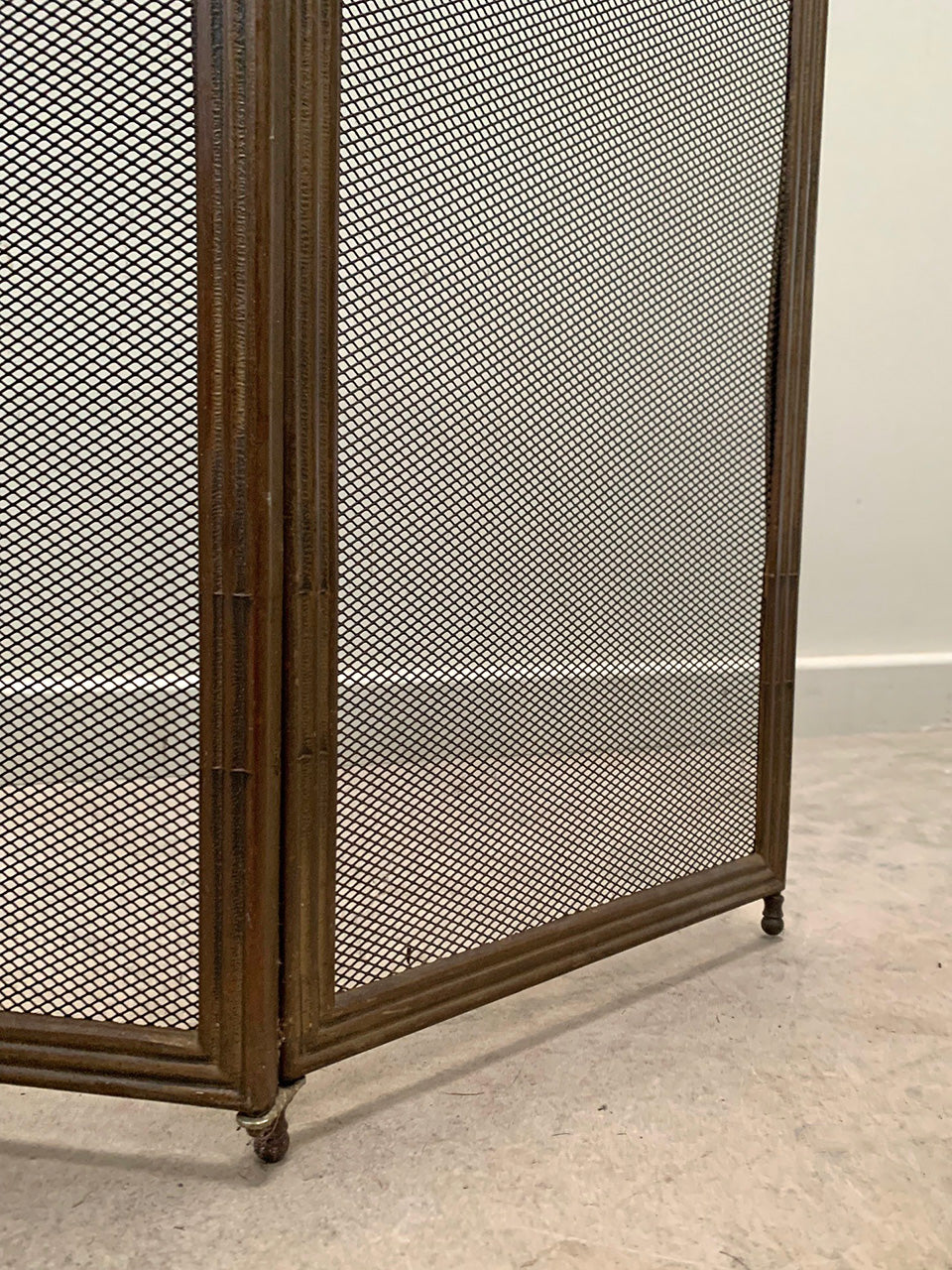 Black mesh fire screen comprising of 4 panels set in a brass surround.
