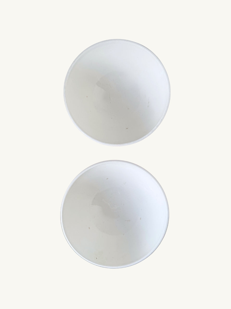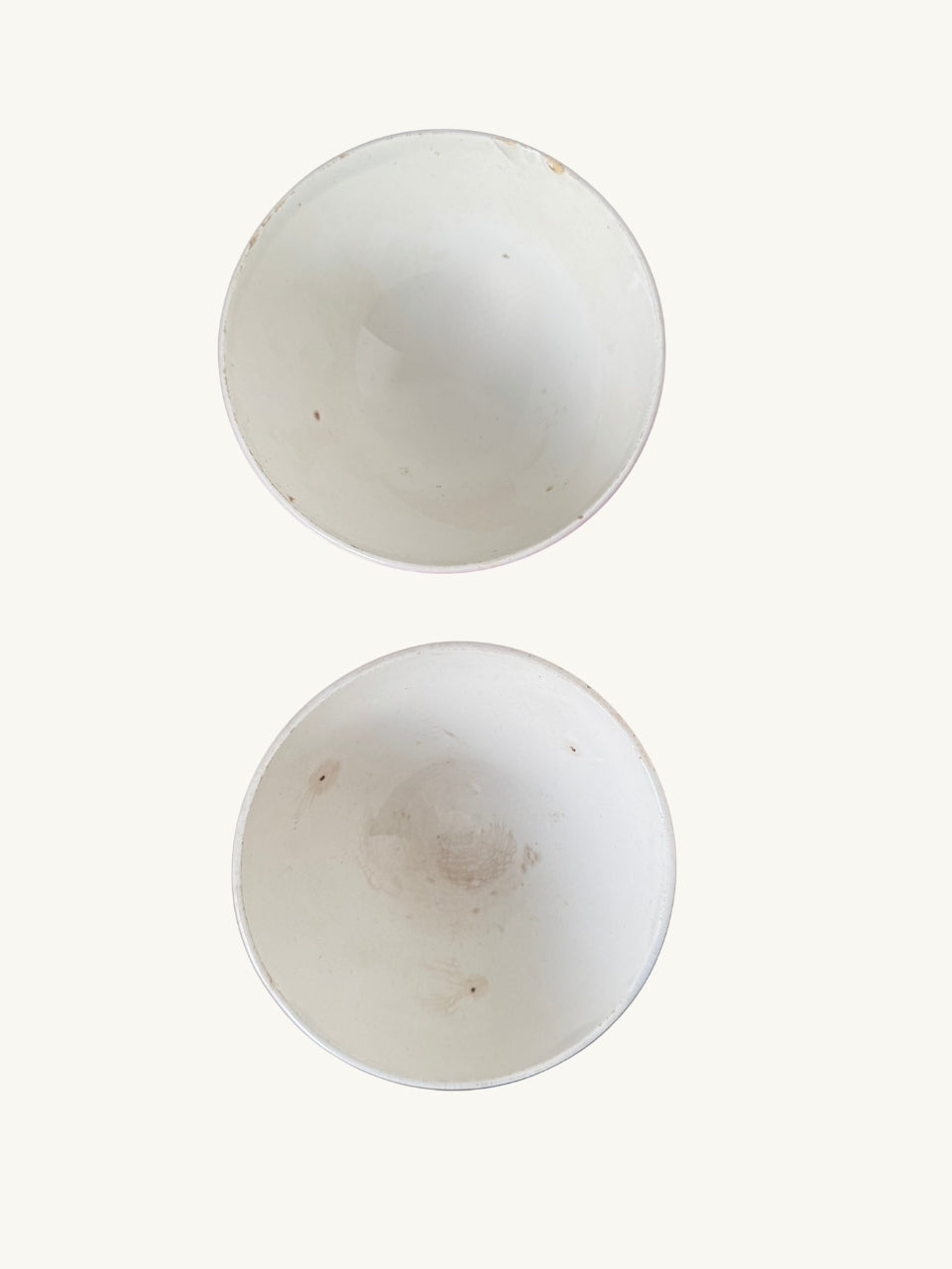 Two are slightly smaller, and the other two are slightly larger. One of the smaller bowls has visible crazing on the inside, and the other has a chip on the rim. In otherwise good condition.