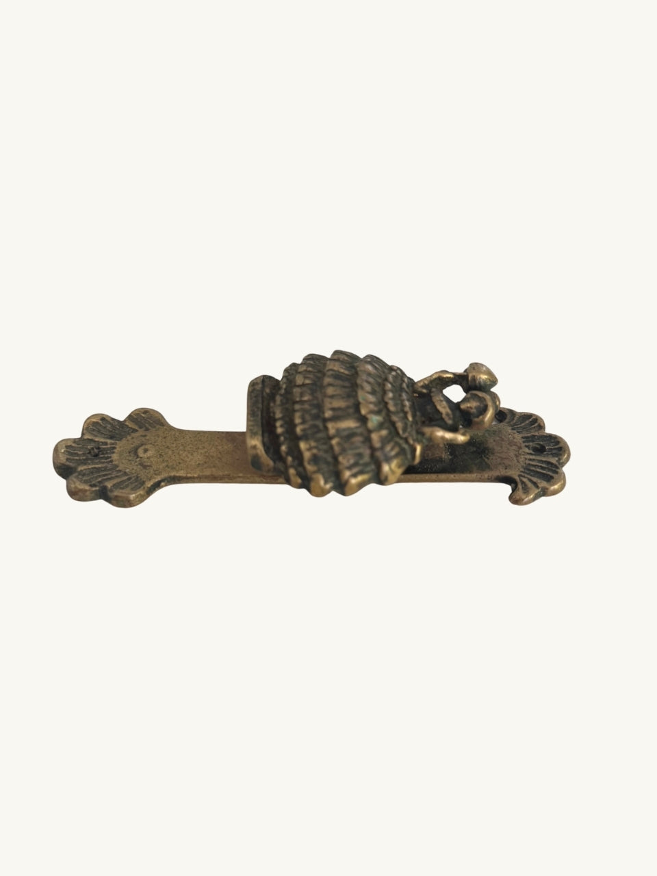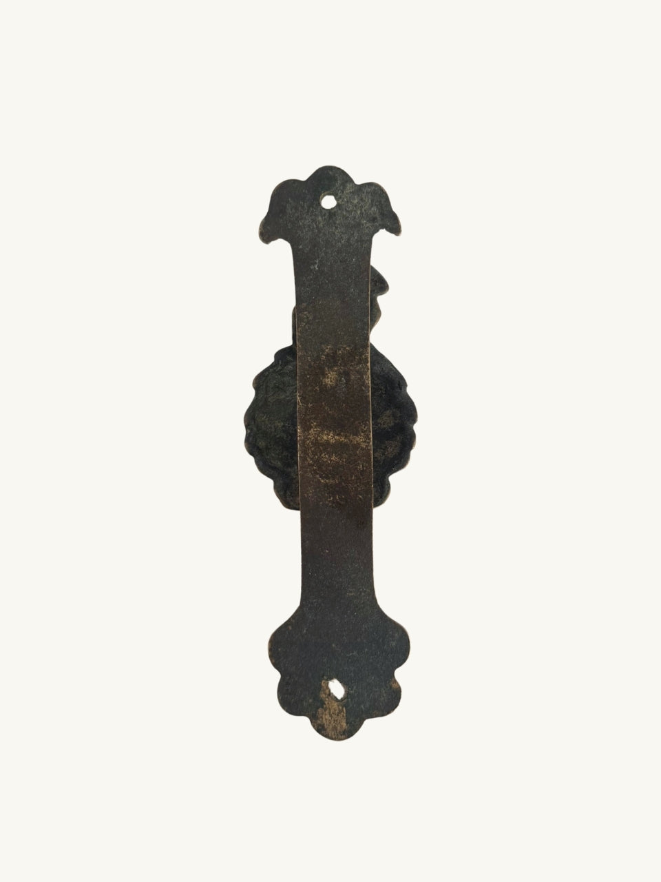 A pretty brass door knocker in the shape of a lady wearing a large dress and holding an object, that seems to be a bell. Small in size, but perfectly usable; the pivot works smoothly.