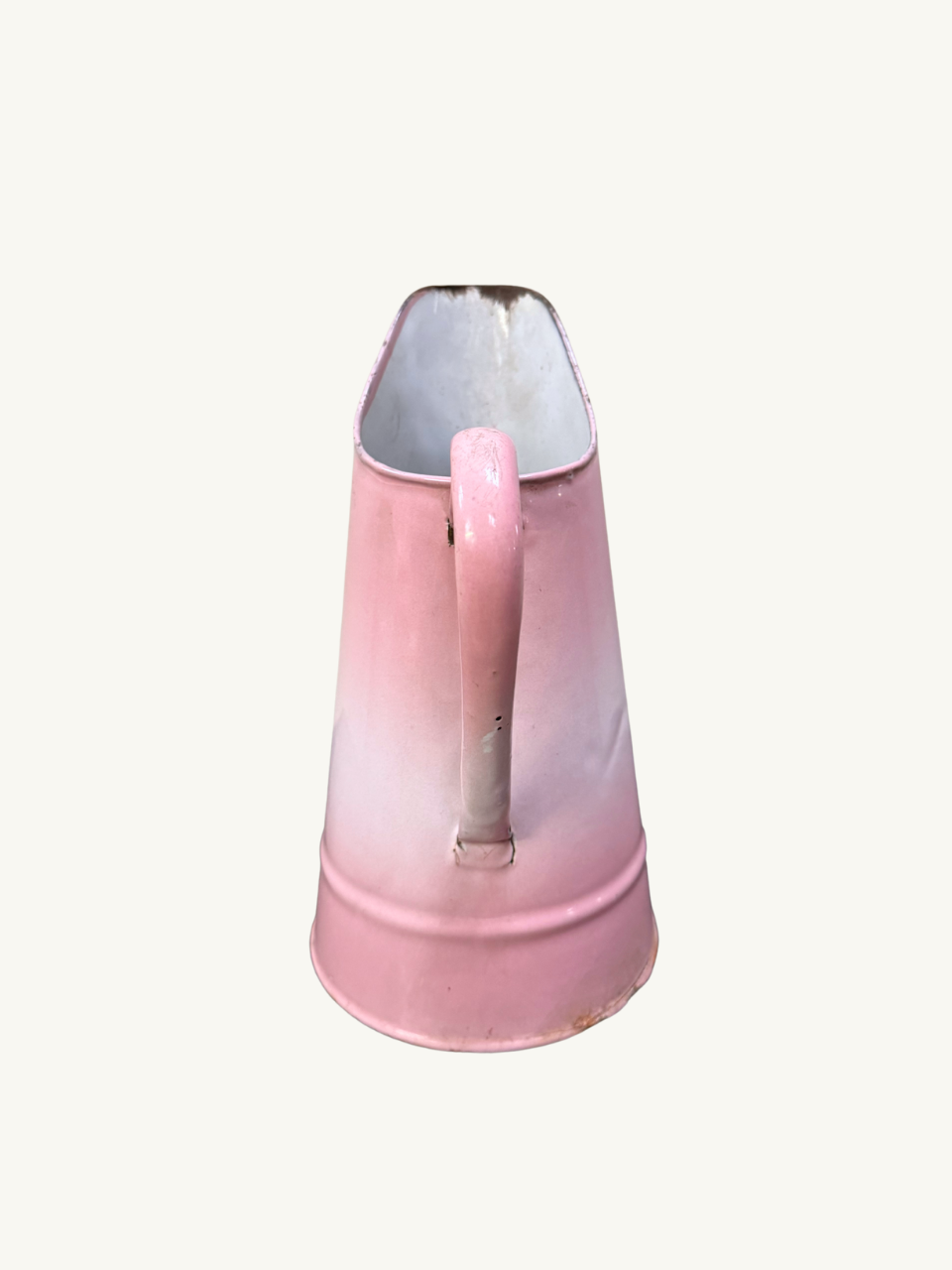 An early 20th century enamel jug, with a pink gradient and a tall spout. It has some minor signs of wear, due to age and use. Very decorative and ideal to use as a vase.