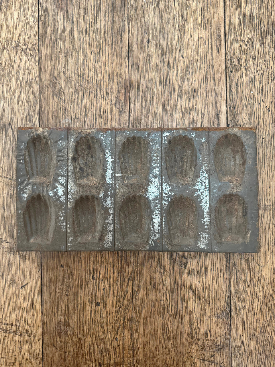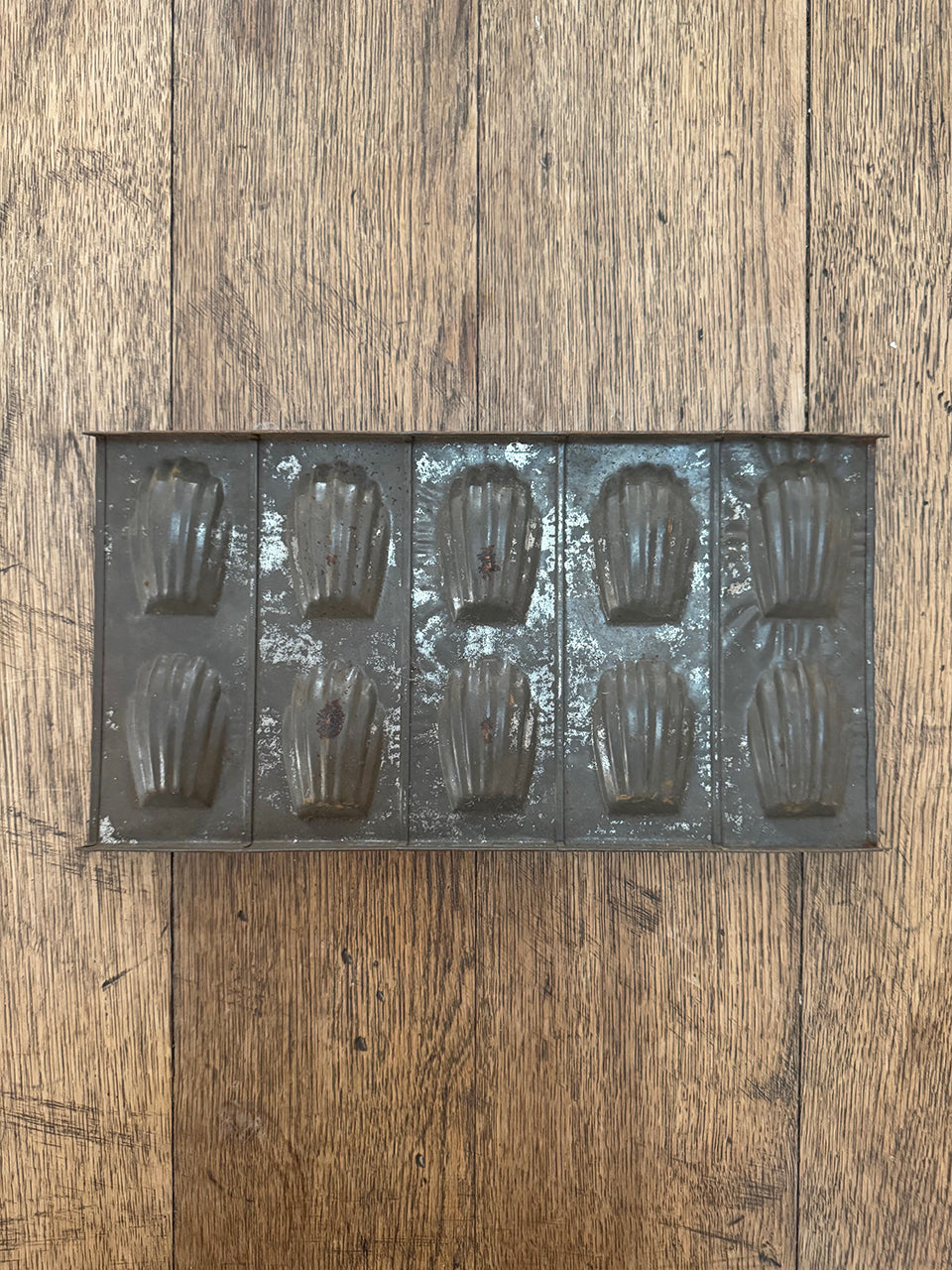 Three rustic metal madeleine trays, circa early 1900s.