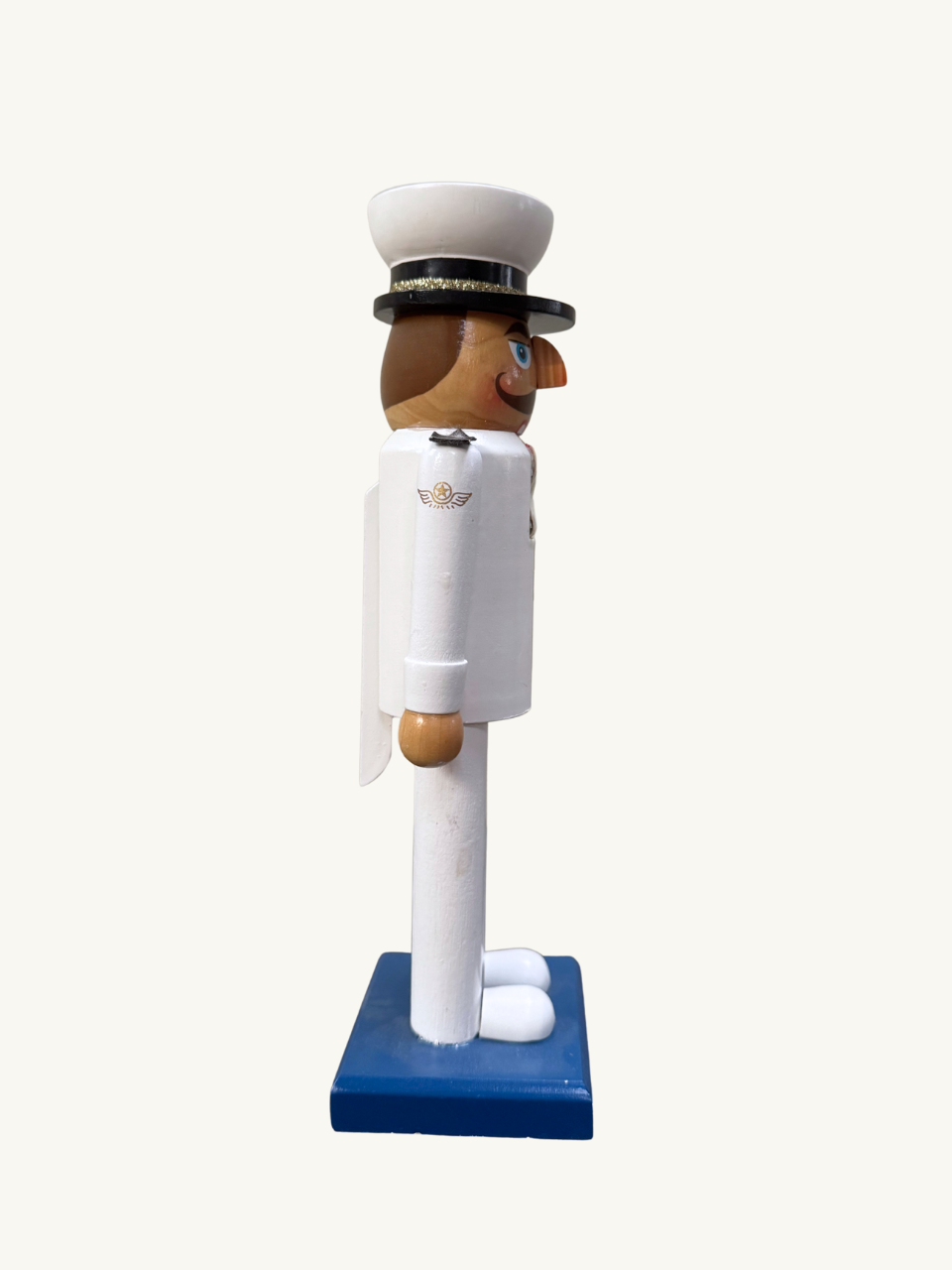 A small lacquered wood nutcracker doll. It has a lever at the back that opens and closes the doll's mouth, which is made of soft leather. A recent piece, in very good condition.