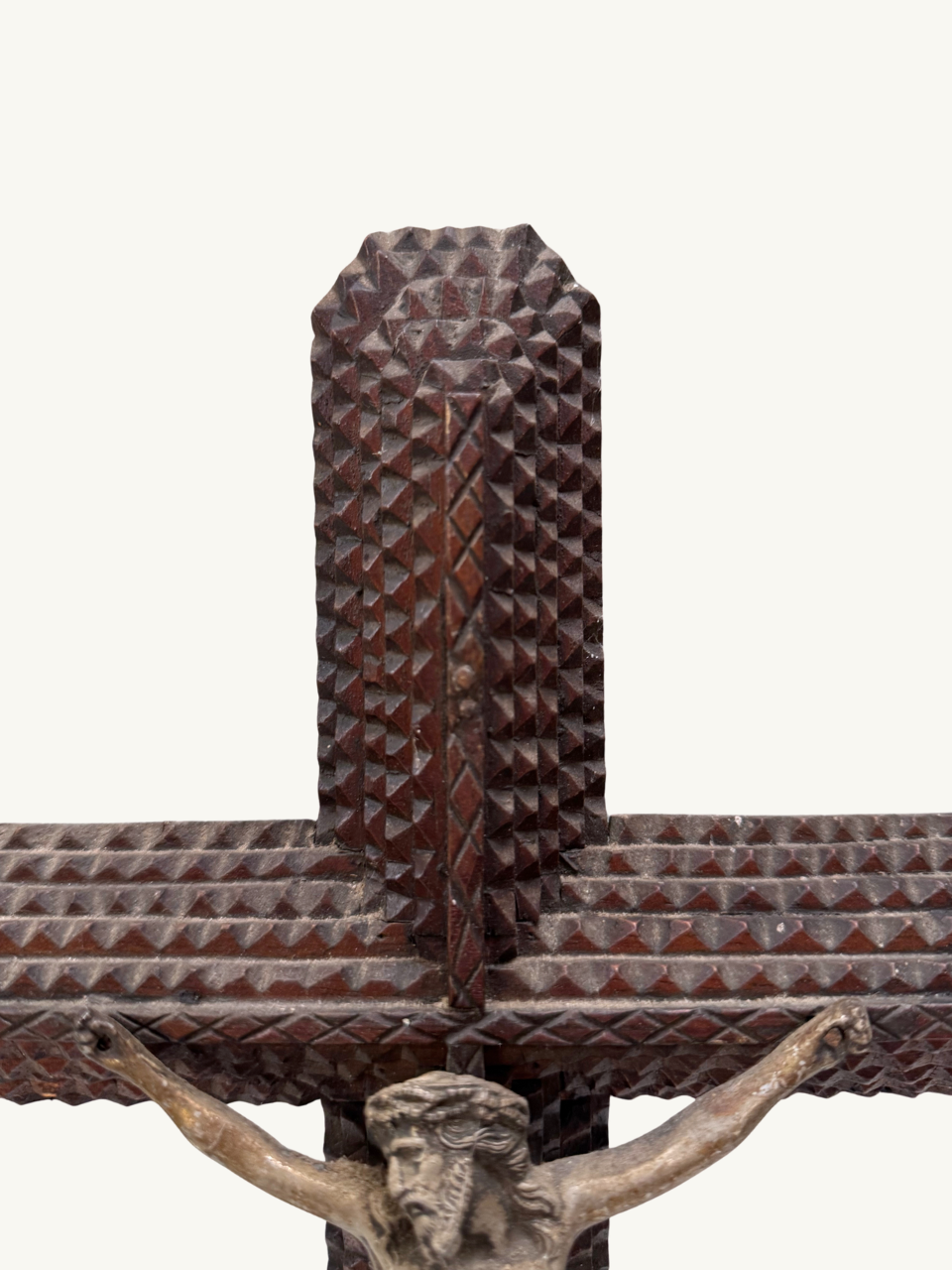 A very rare tramp art crucifix, which is believed to have been made by prisoners. The carved geometric pattern is beautifully crafted and consistent throughout the piece. Sourced near Limoges, central France.