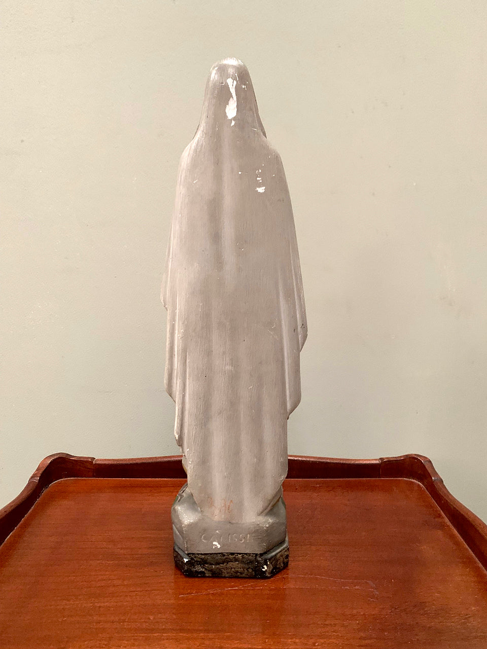 Statue of Our Lady. Wearing a draping shawl and a blue sash, with a beaded and silver coloured cross draped over one arm and with palms together.