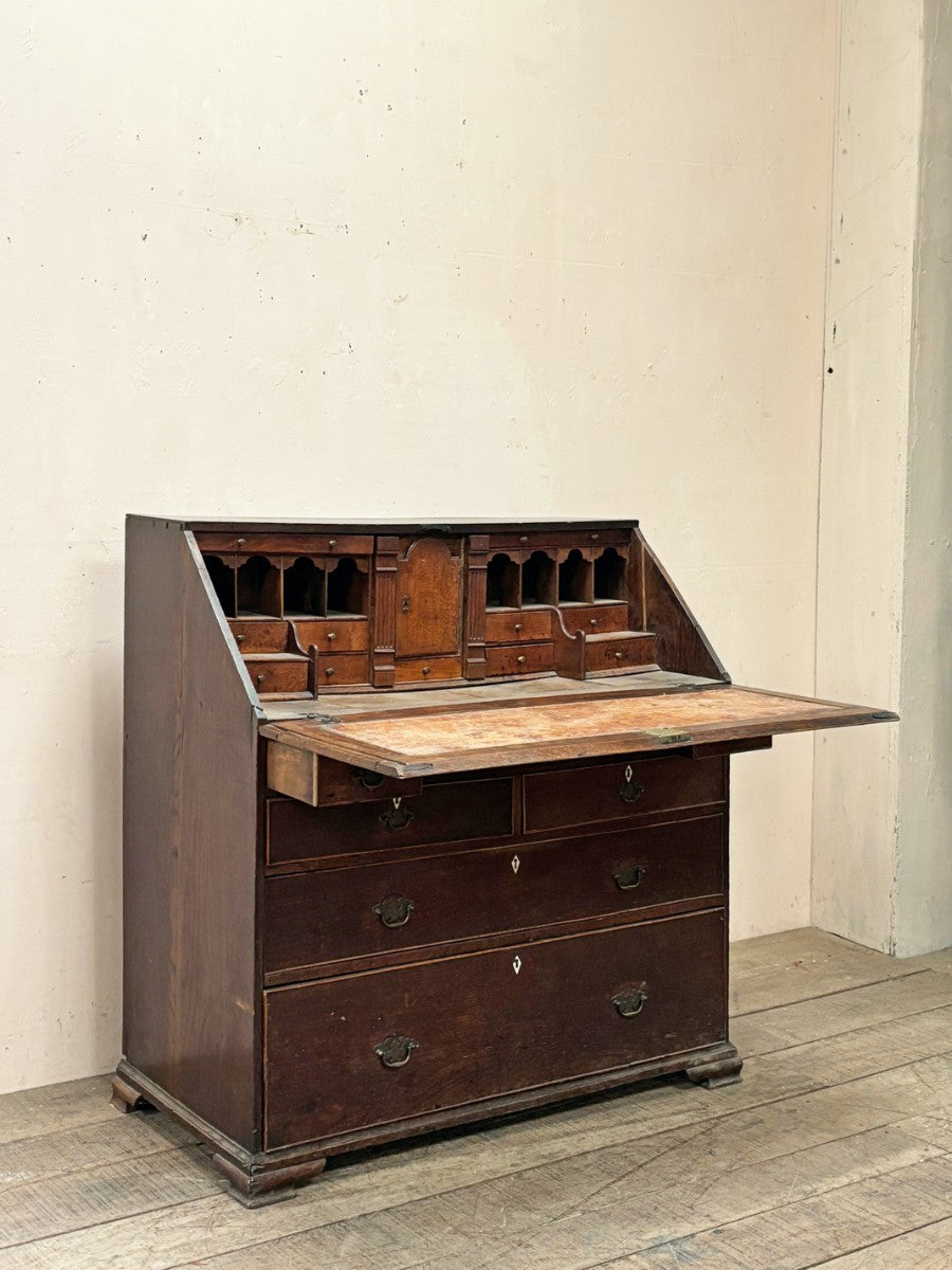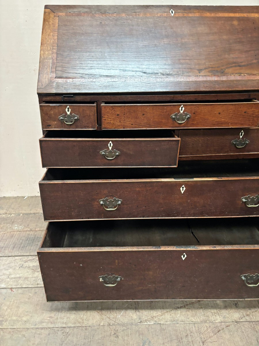 Large scale late 18th century oak bureau with wonderful, slightly wonky, interior in untouched condition, retaining ink stains and 2 centuries of wear.