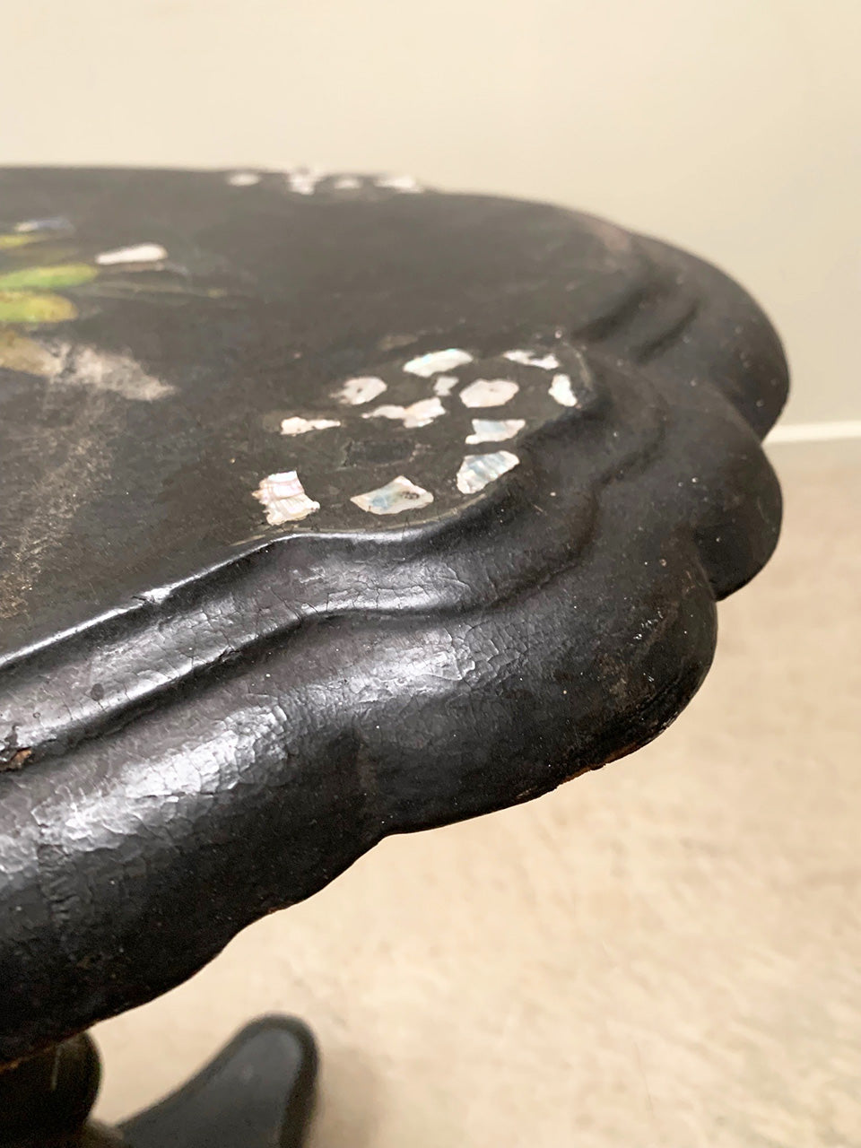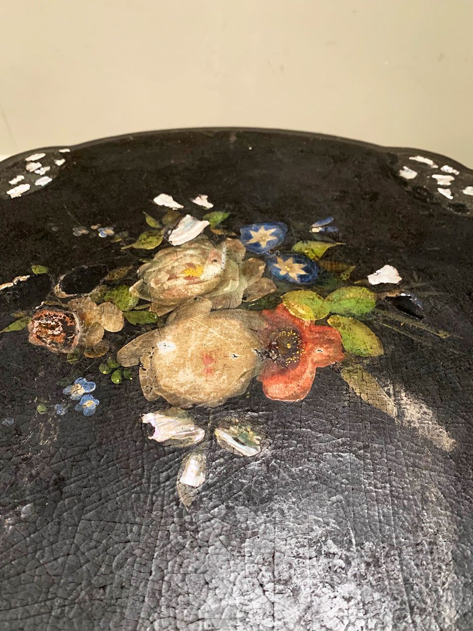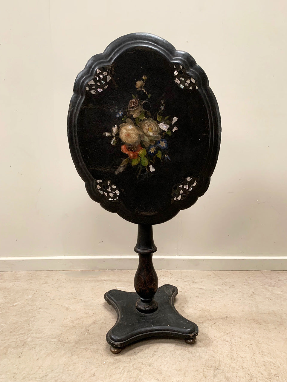 Pretty late 19th century ebonised tilt top table with stylised pearl inlay accents and a painted central floral decoration.