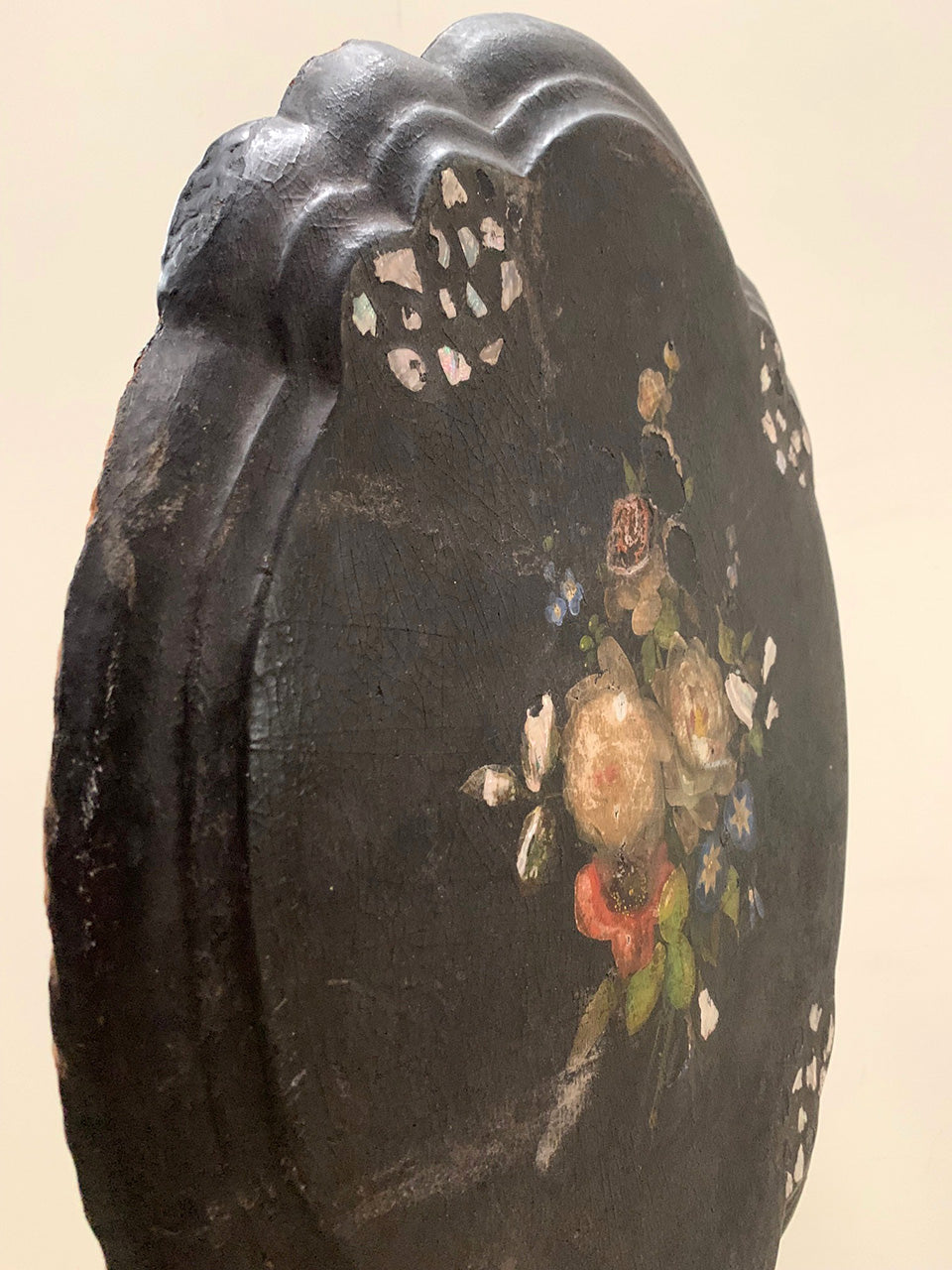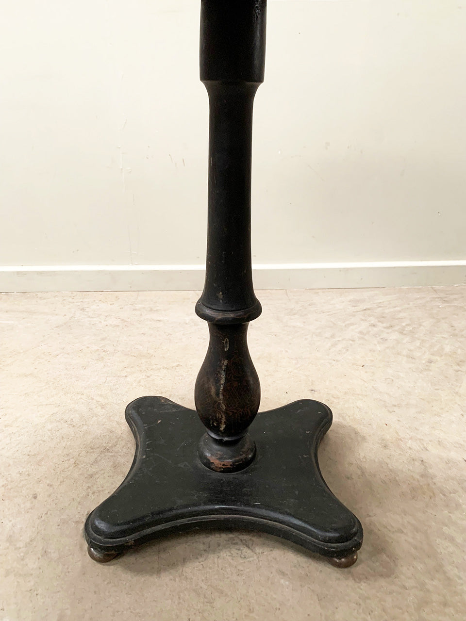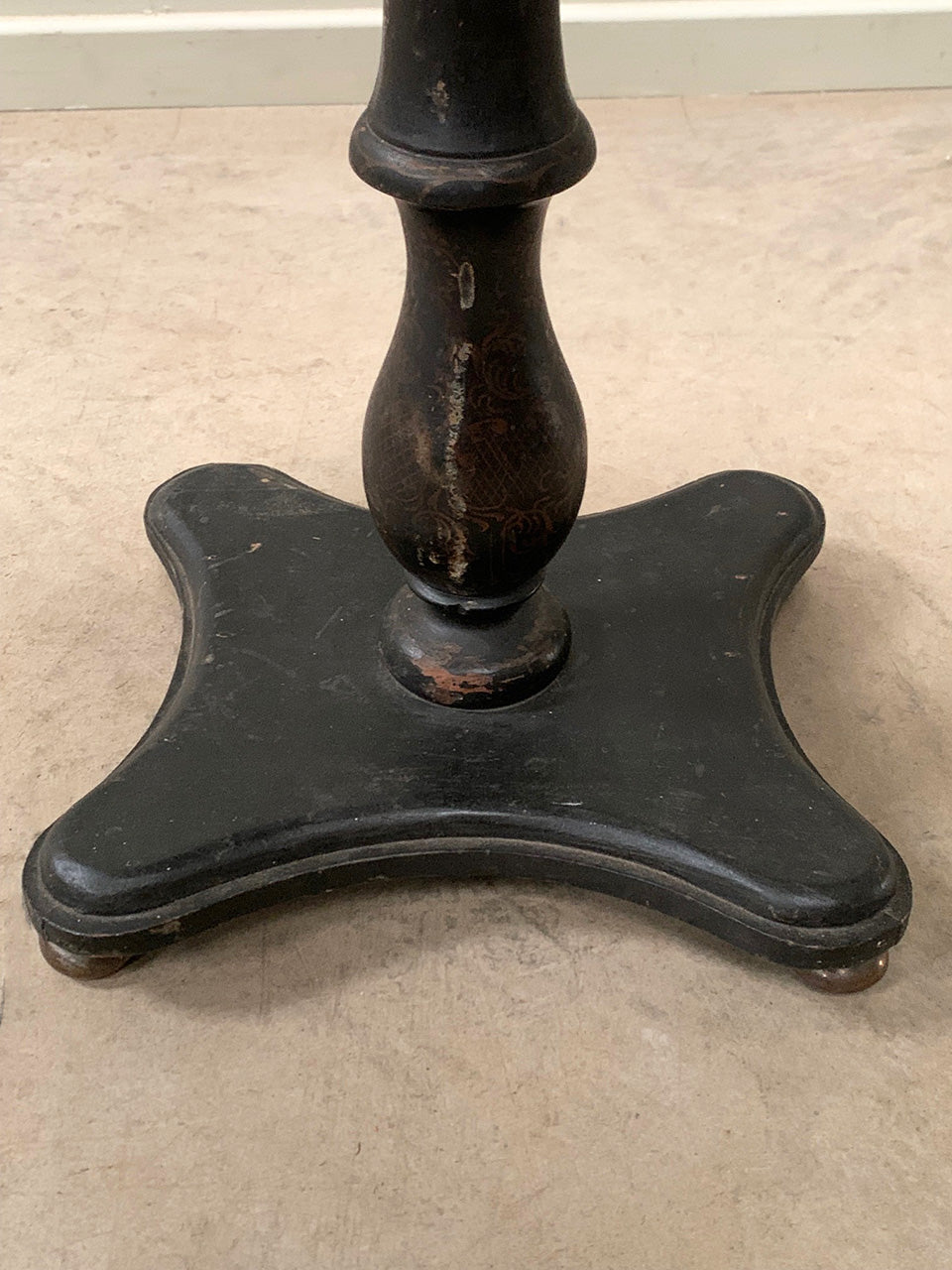 Pretty late 19th century ebonised tilt top table with stylised pearl inlay accents and a painted central floral decoration.