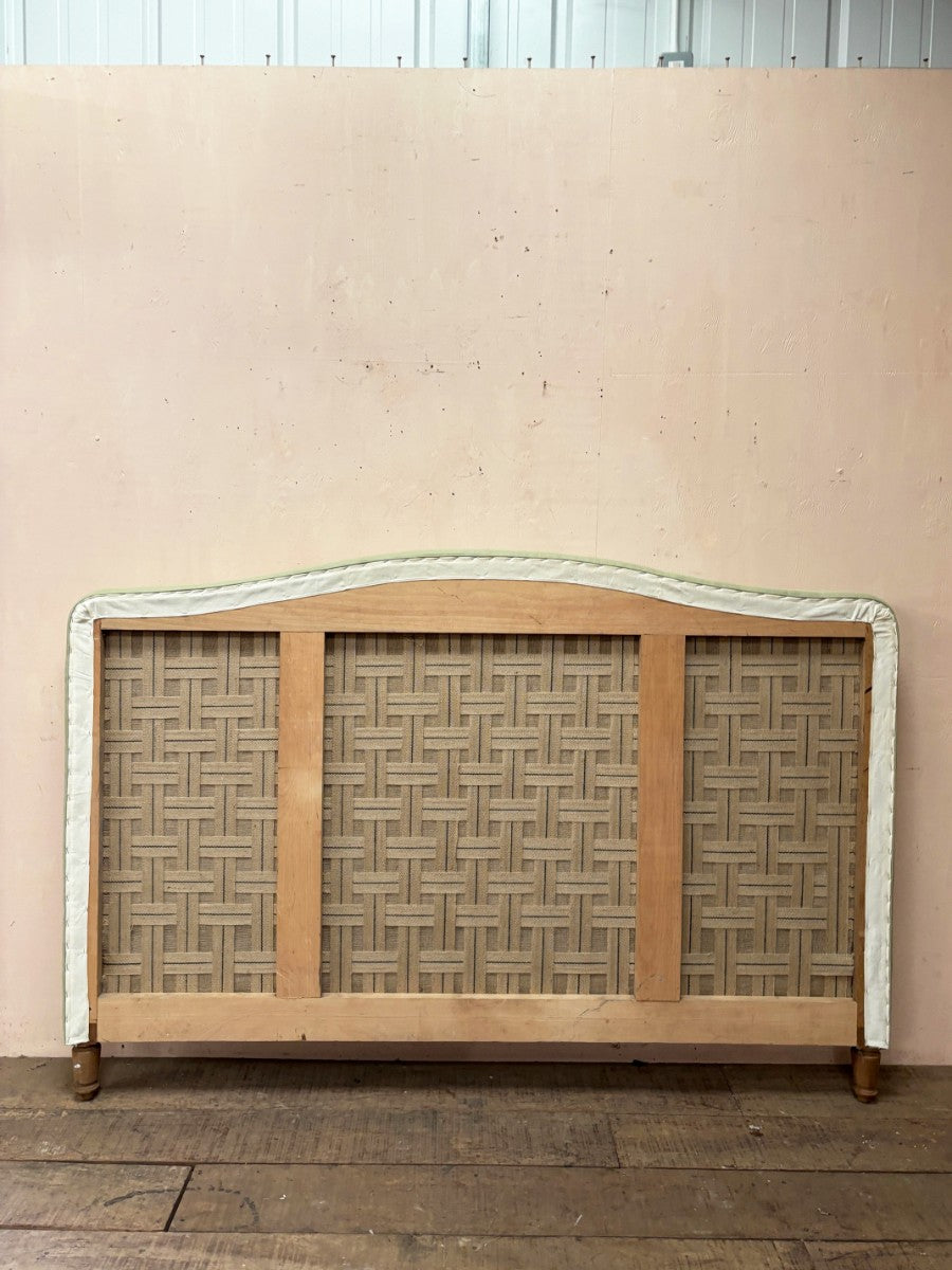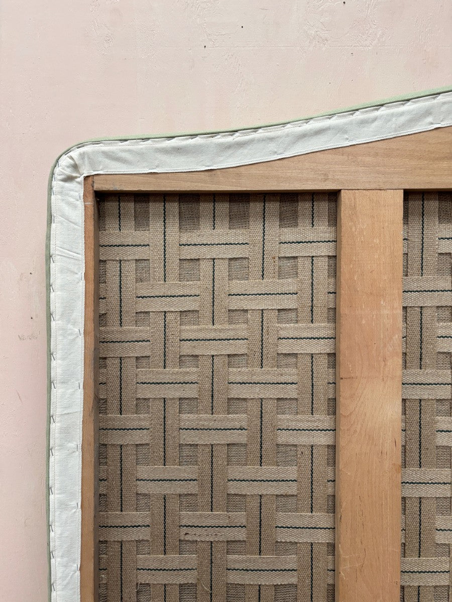 In-house made super king size bed head, with hardwood frame and traditional fillings, finished here in mid weight green linen with piped detail to top edge.