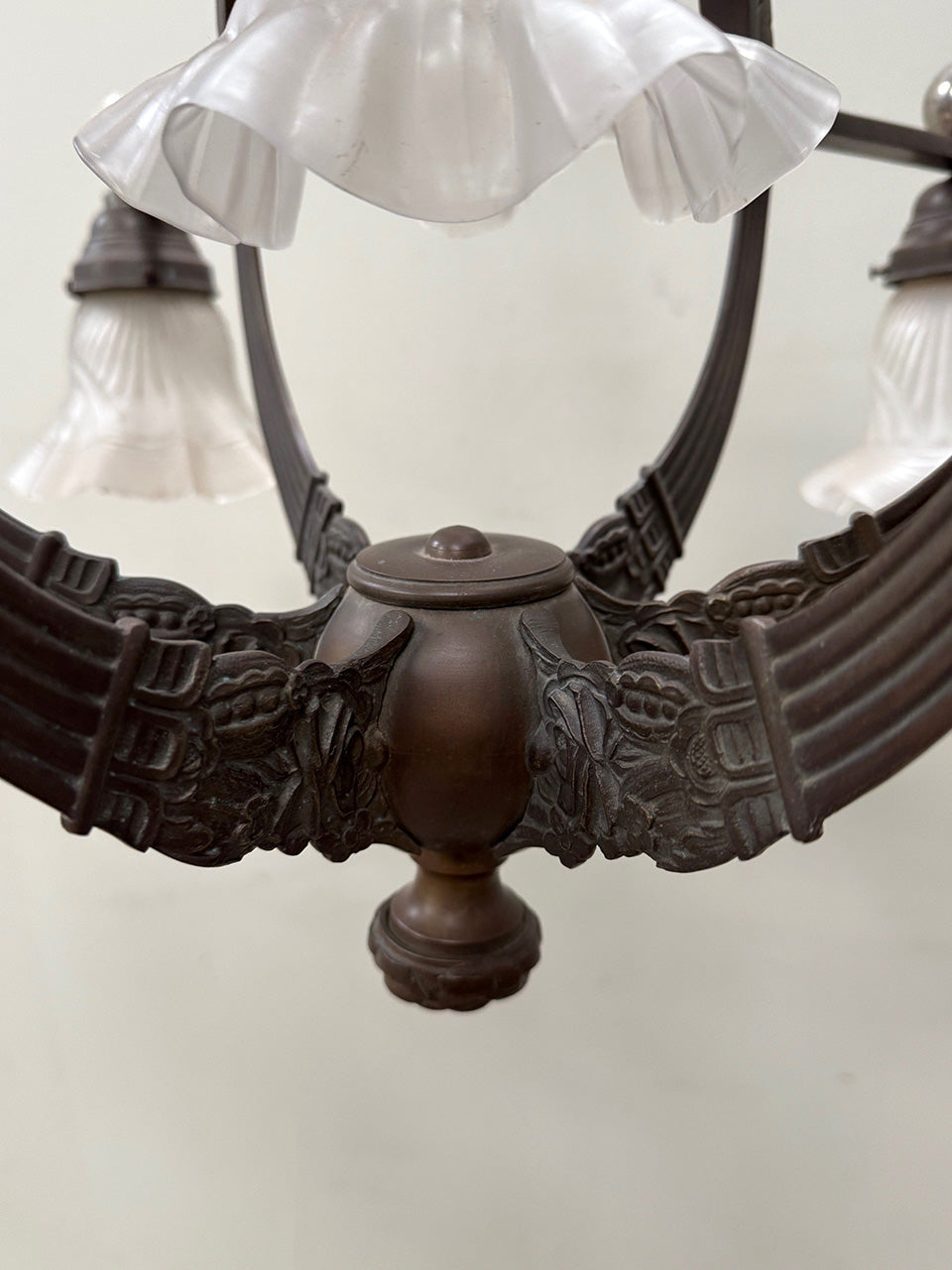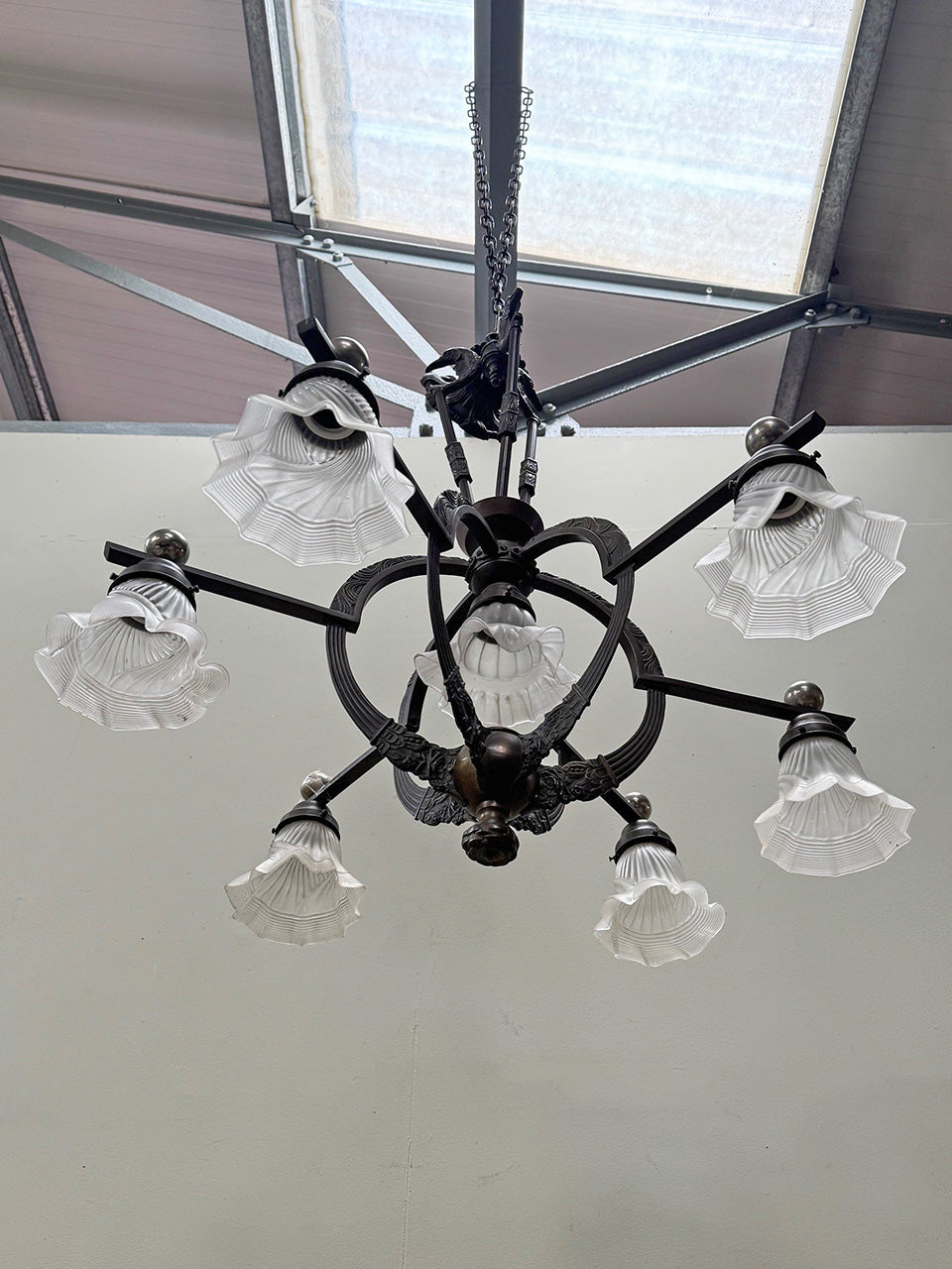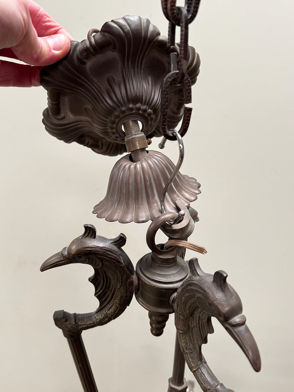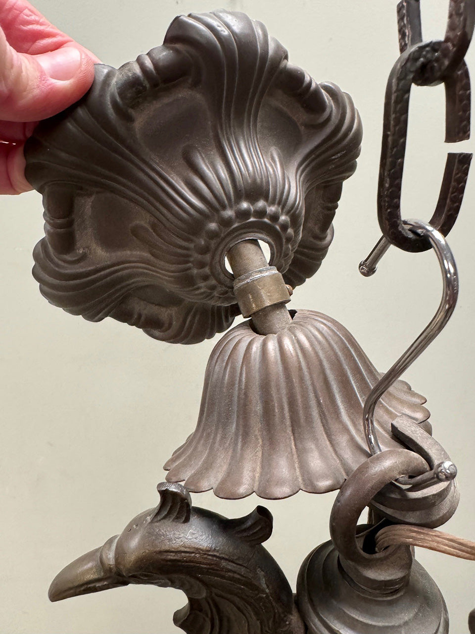 Mythical, curved, fish style forms sit beneath the beautiful celling cup.