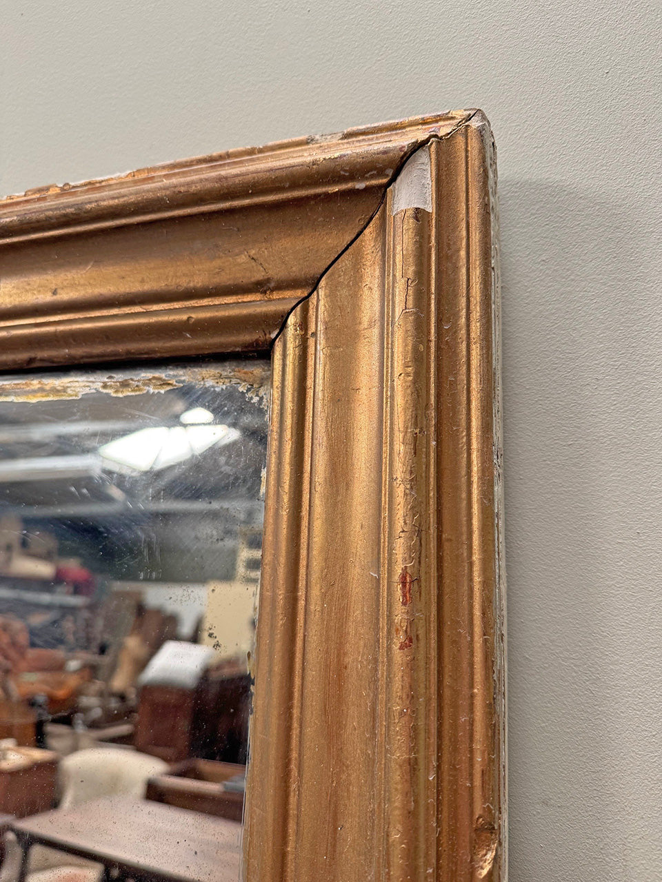 Very imposing in appearance, the frame is gilded with some beautiful red bole showing through, there is some spot foxing to the mirror plate, and the backing panels are all intact.
