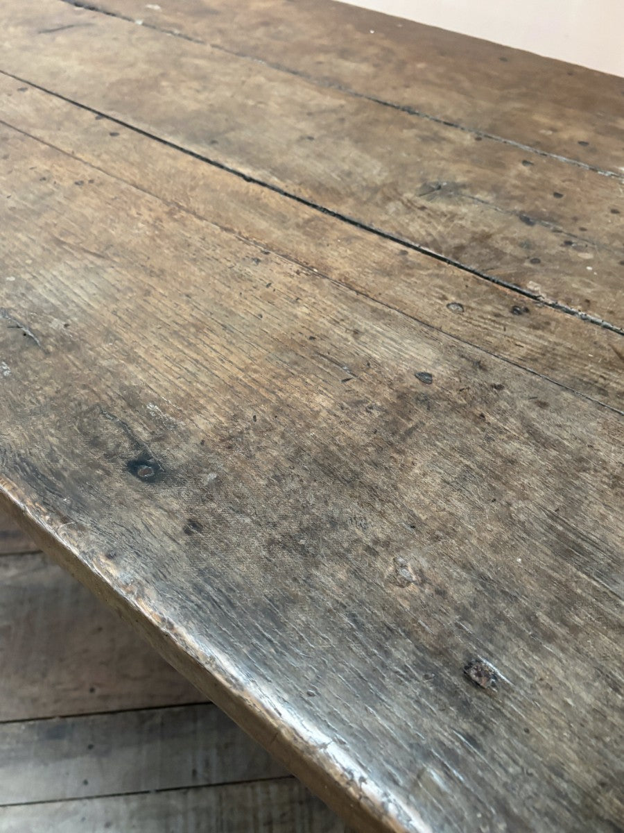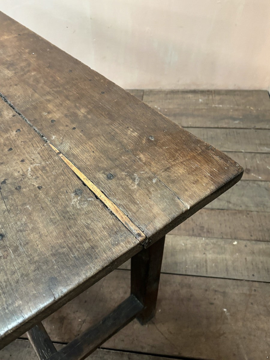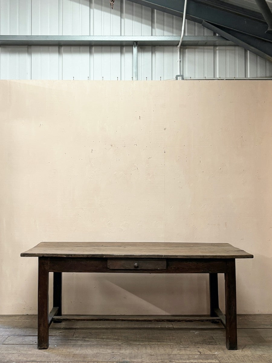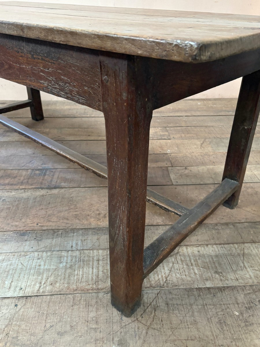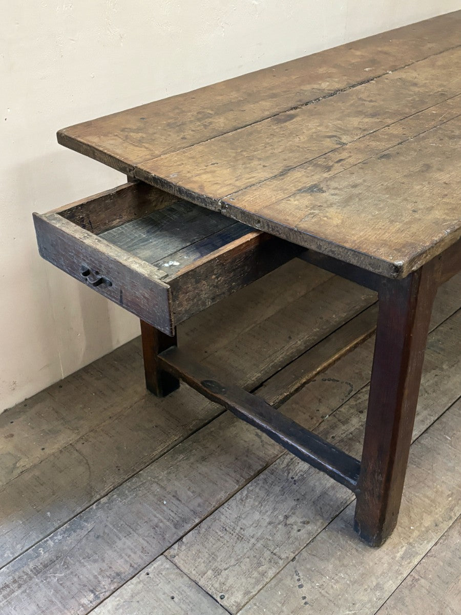 Perfect colour on this late 18th century solid oak farmhouse table with stretcher base and 2 small drawers.