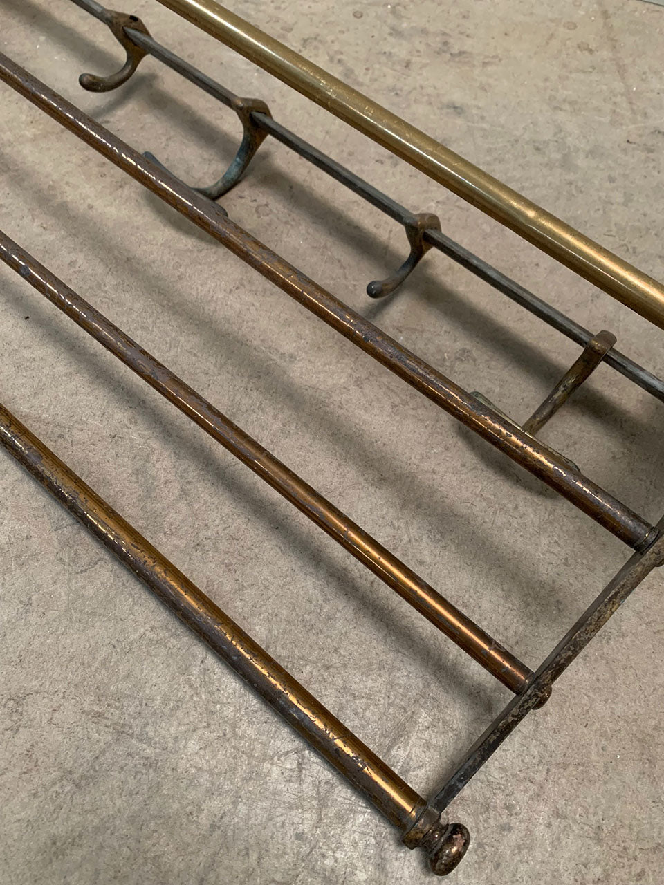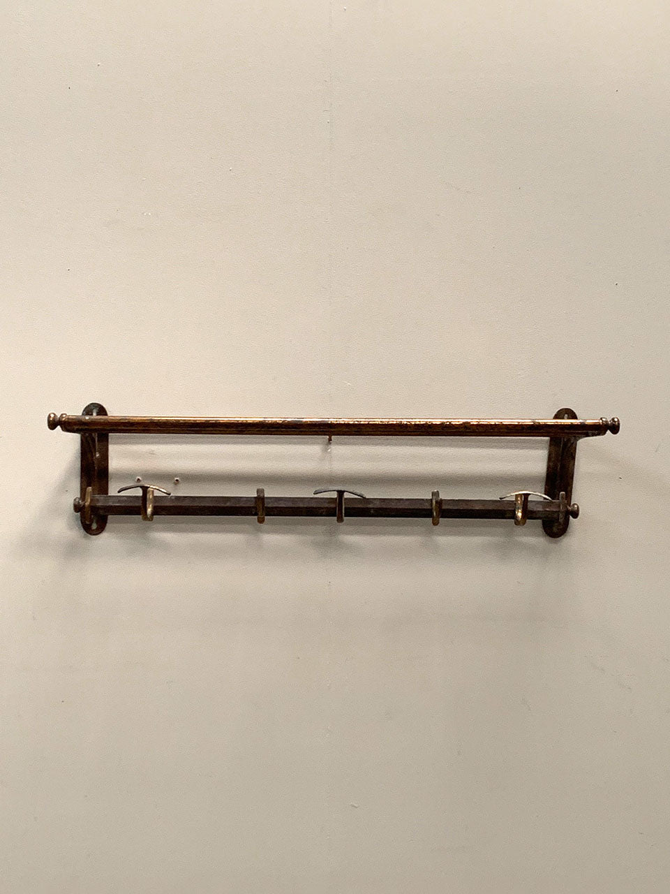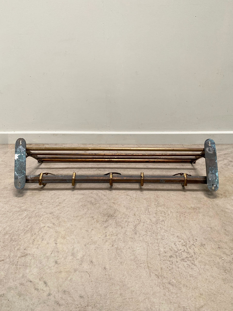 Handsome brass luggage rack with 5 coat hooks that can slide along the back bar, and a top shelf for storage.