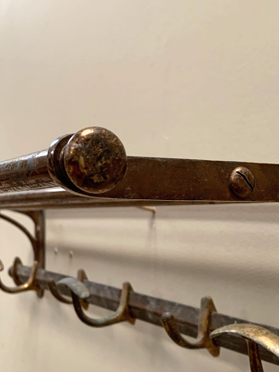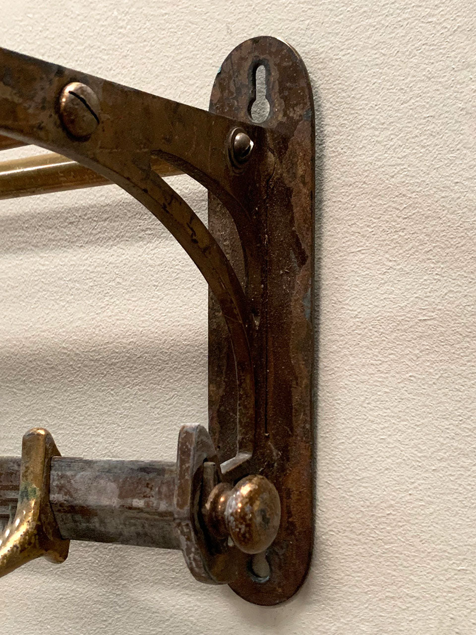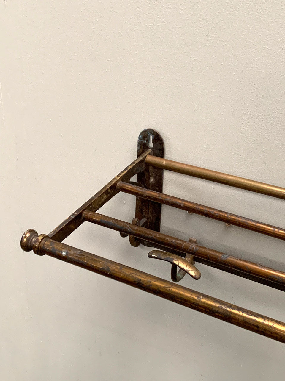 Handsome brass luggage rack with 5 coat hooks that can slide along the back bar, and a top shelf for storage.