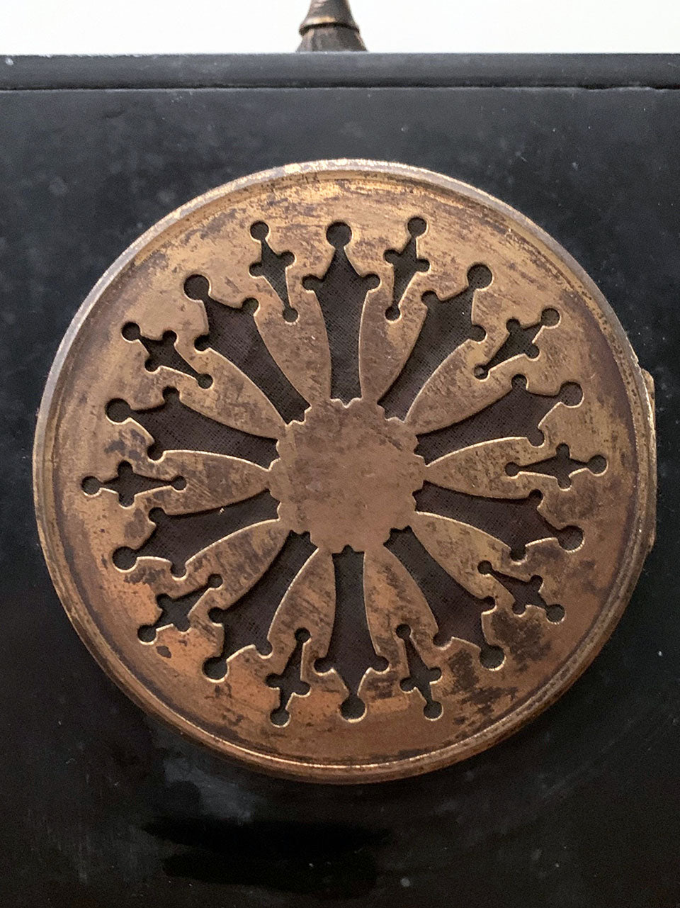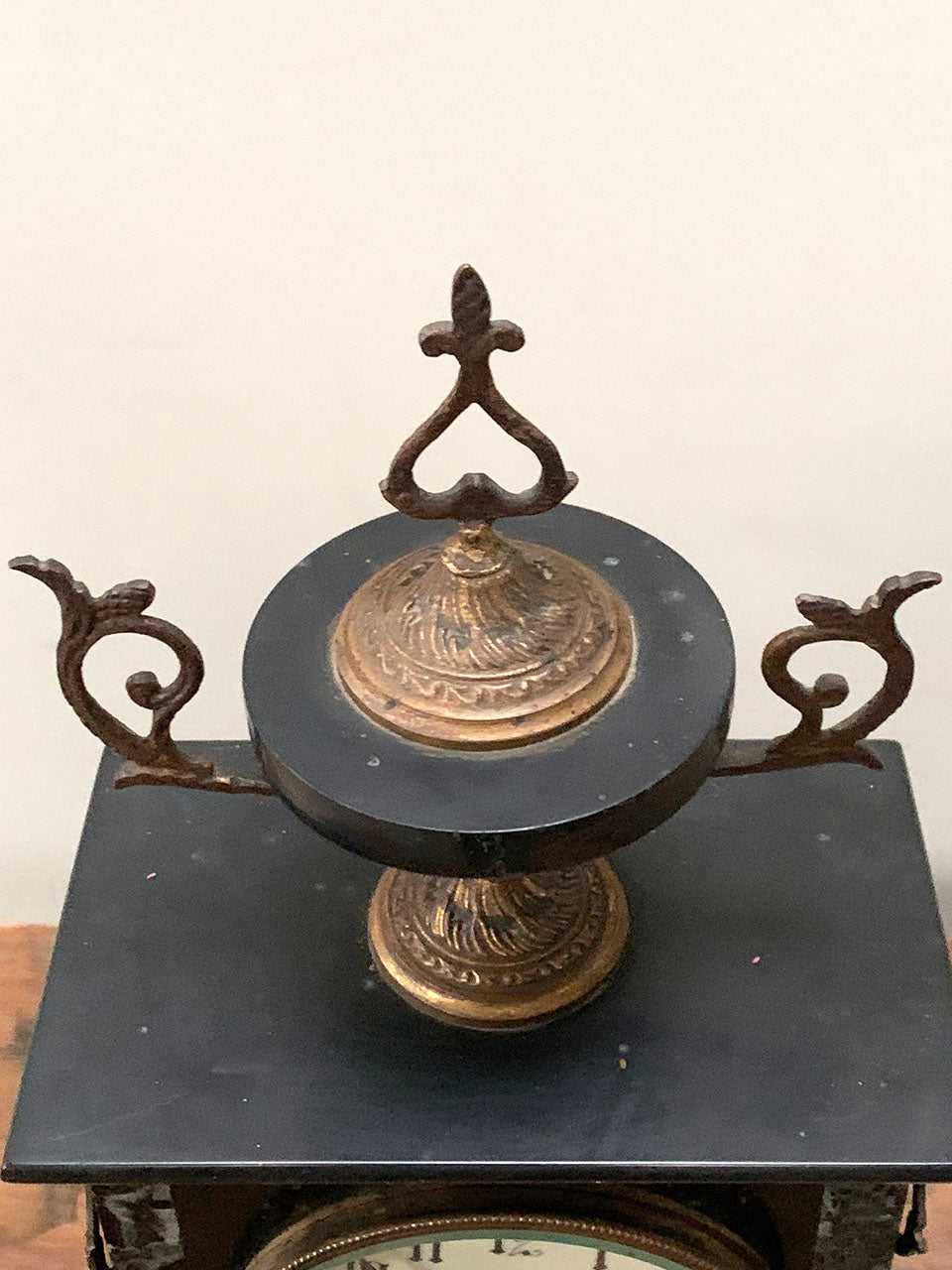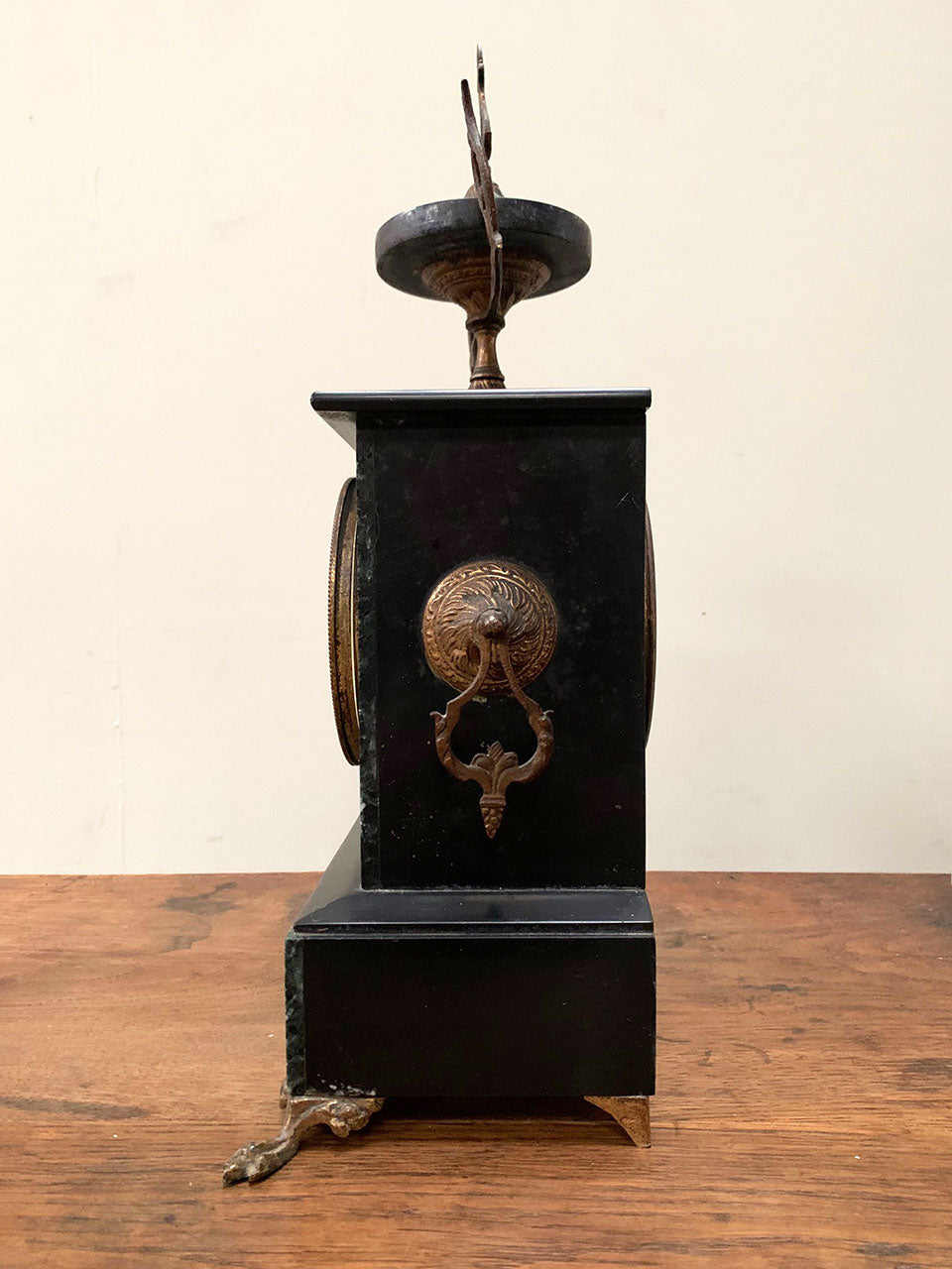 Black slate mantle clock with a brass case and an enamelled circular dial.