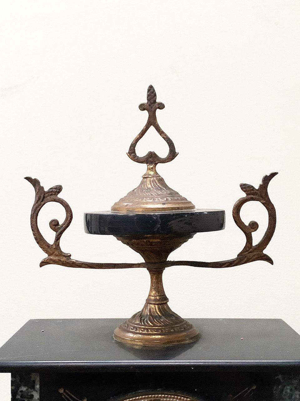 There are green marble edgings, paw feet to the front, brass ring handles at the sides and topped with a classical urn finial.