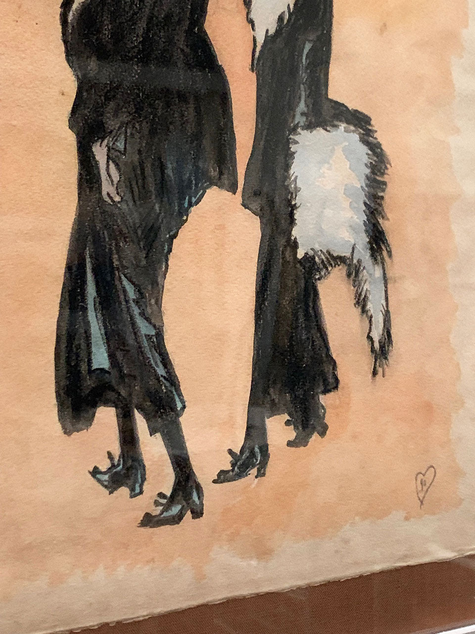 A colourful oil pastel drawing, circa early-mid 20th century, depicting two ladies in plush fur outfits.