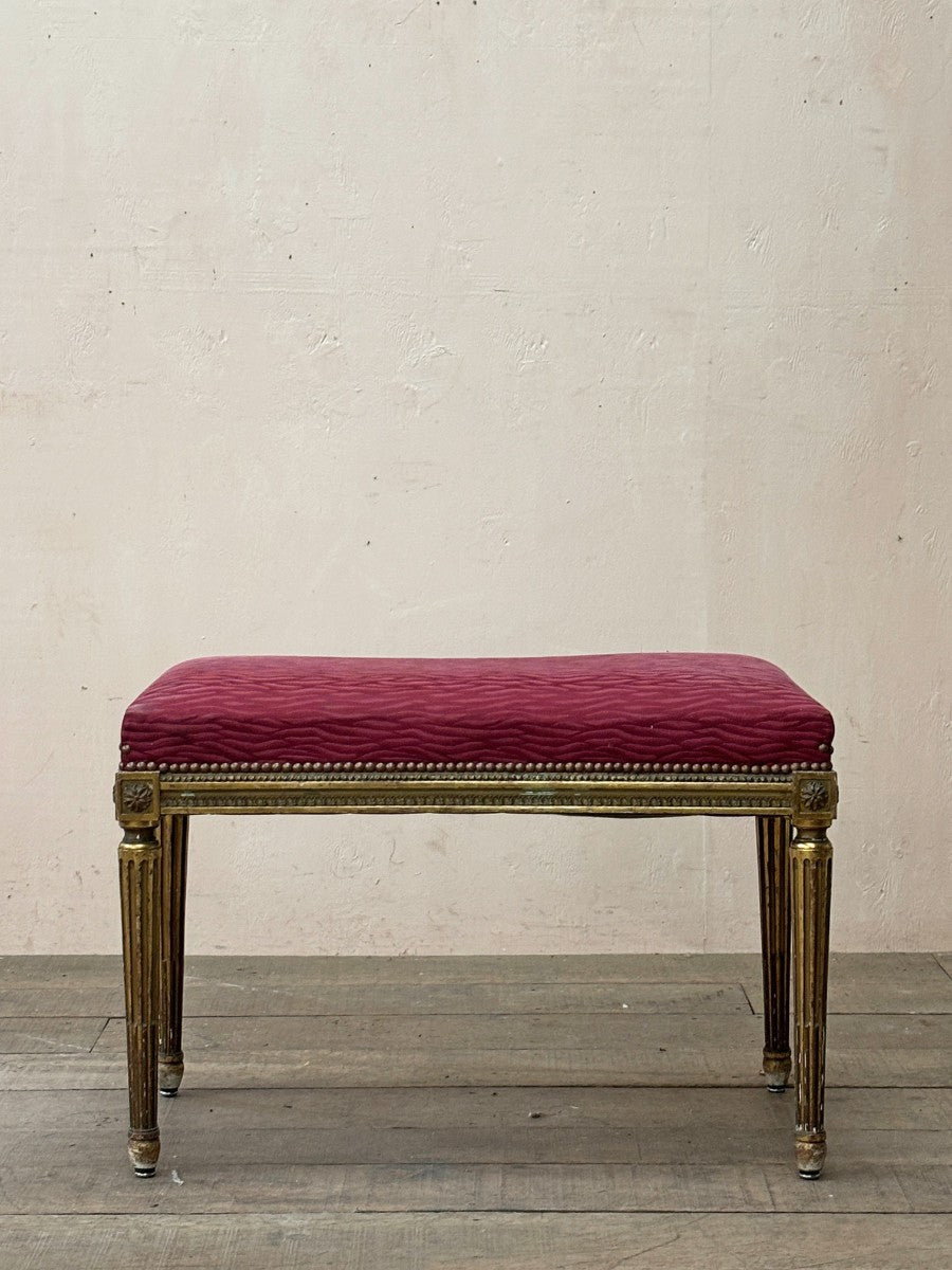 Mid to late 19th century carved and water gilded stool in the Louis XVI style, retaining later upholstery fabric which is damage free.