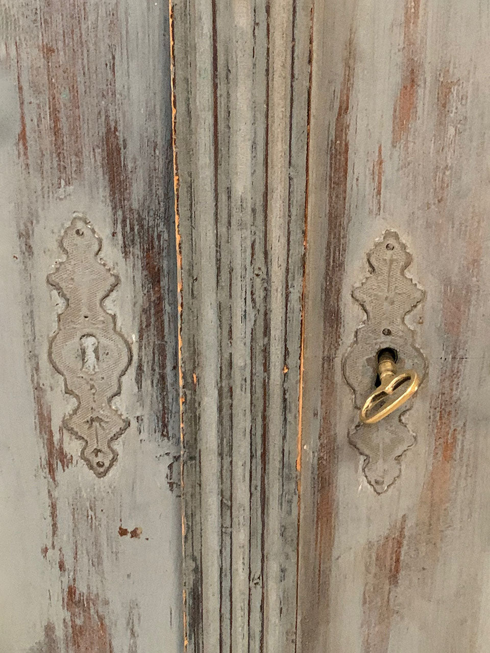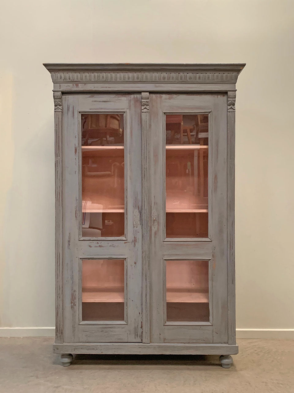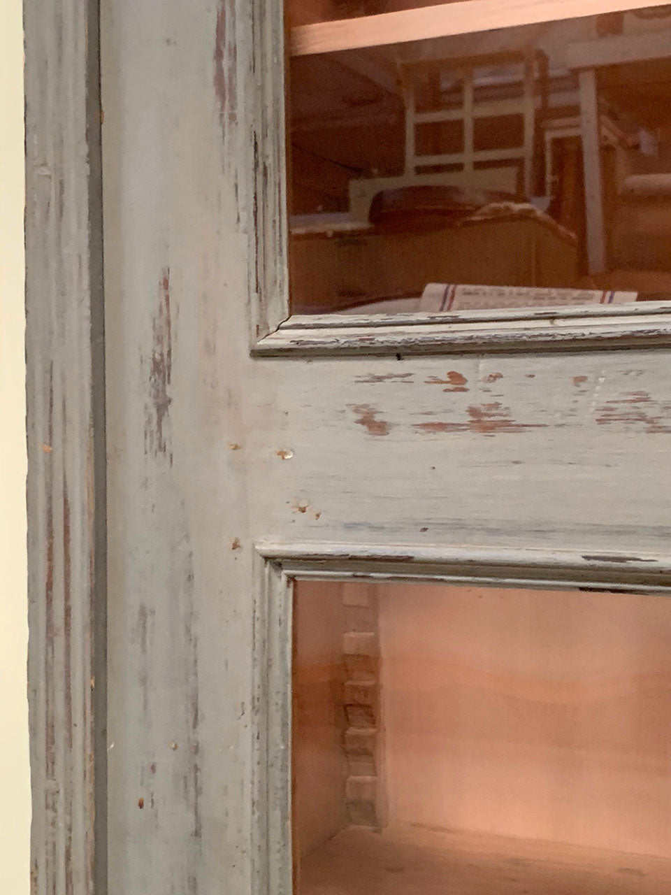 Glazed storage cupboard in a bluey/grey paint with a distressed finish.