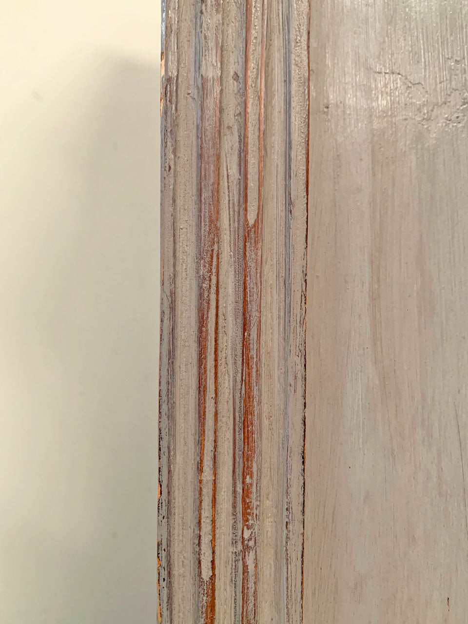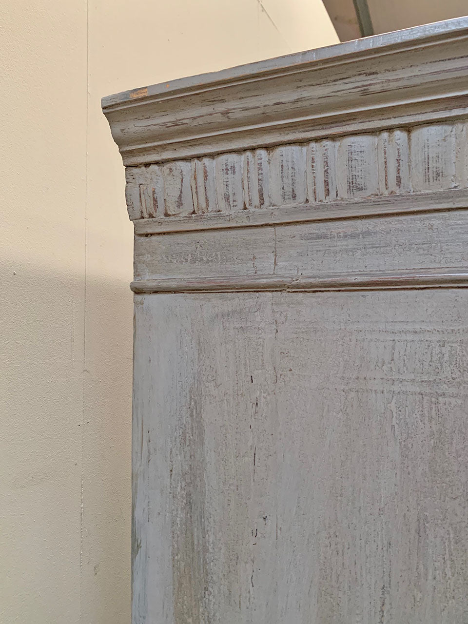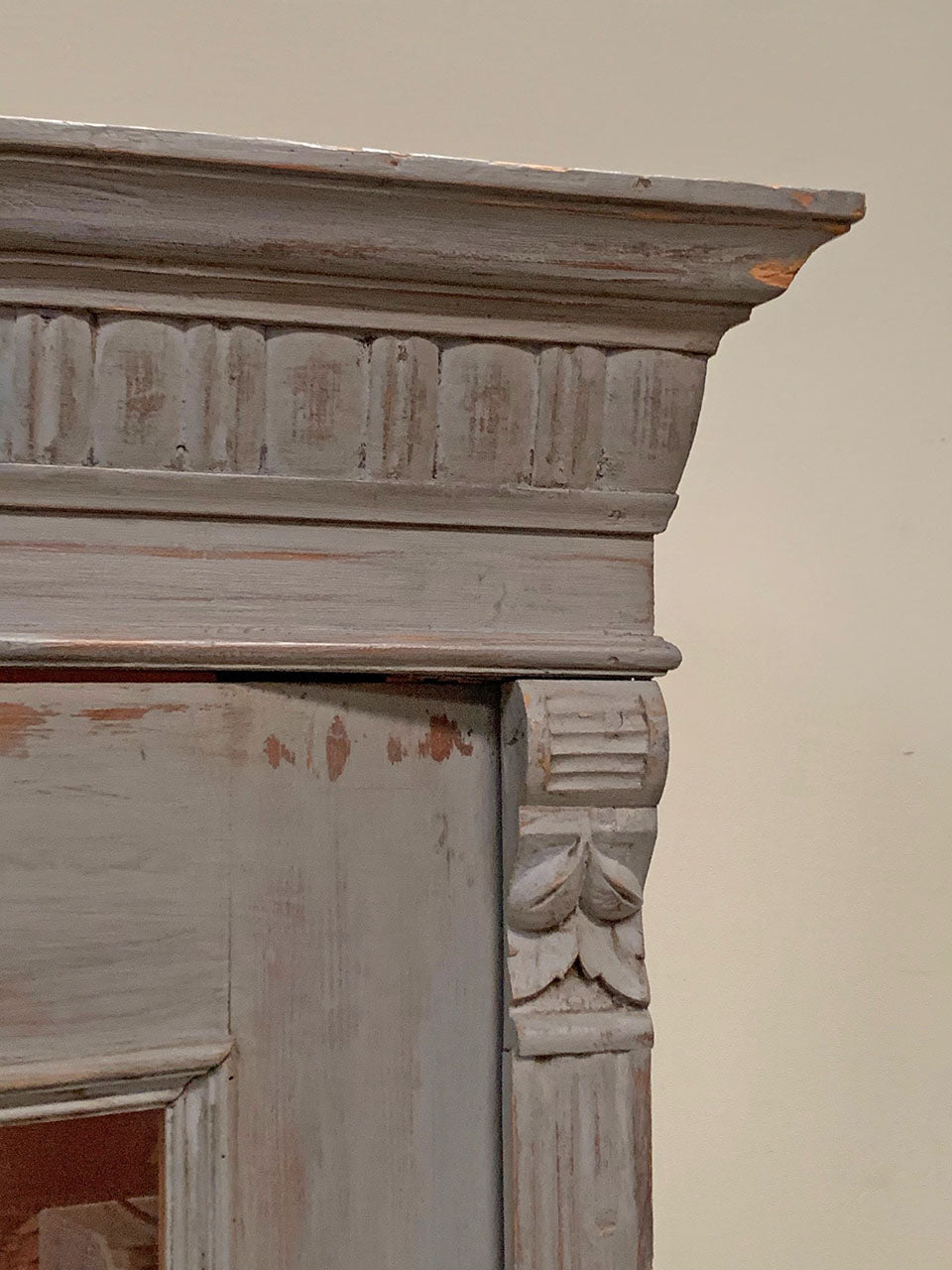 Glazed storage cupboard in a bluey/grey paint with a distressed finish.