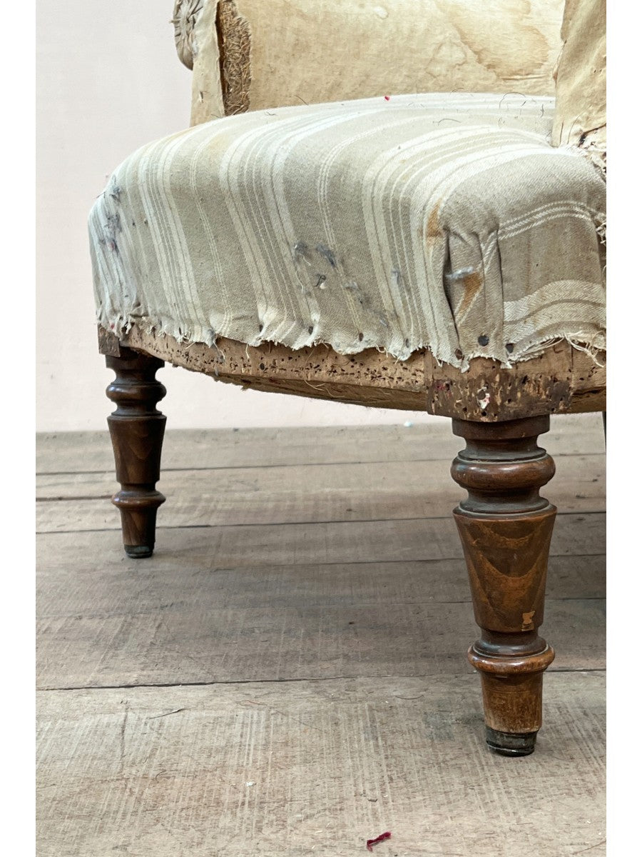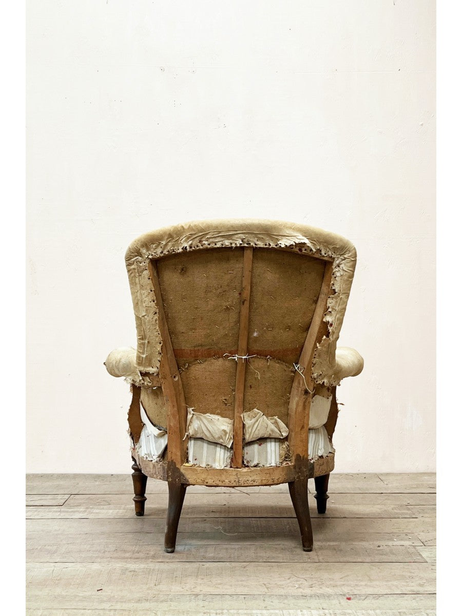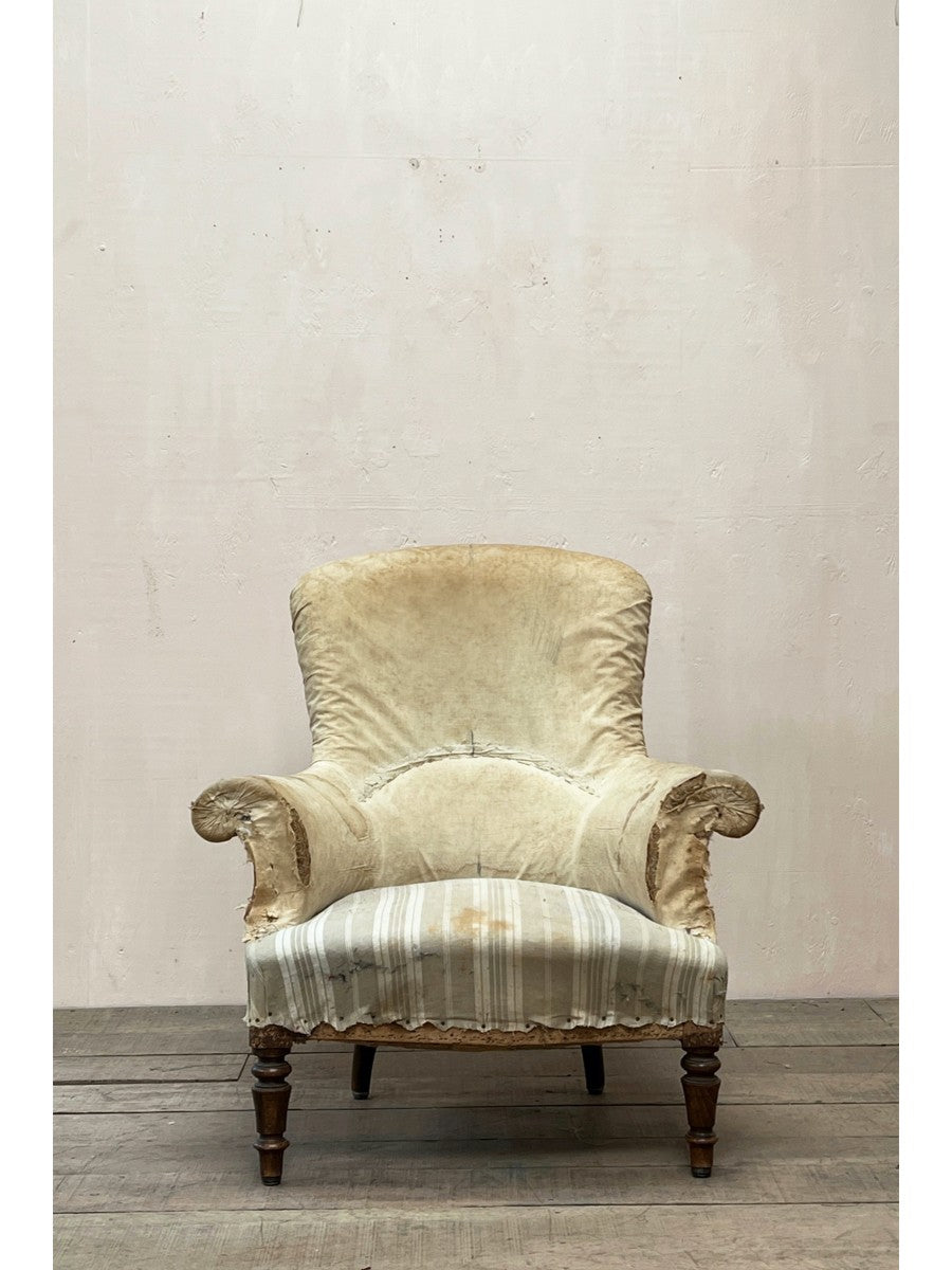 Generous mid 19th century armchair with pronounced scrolled arms, lumber support and welcoming curved back.