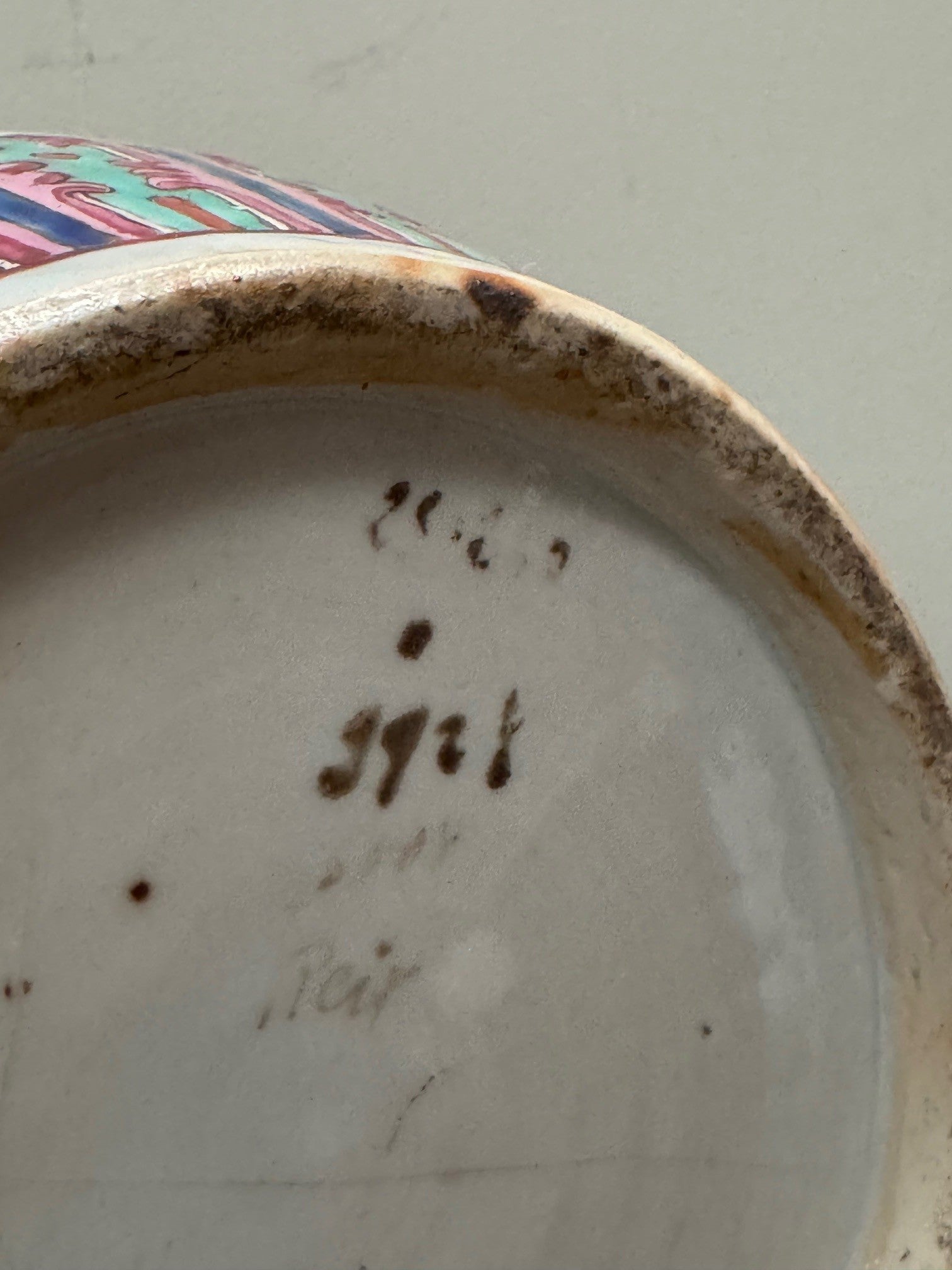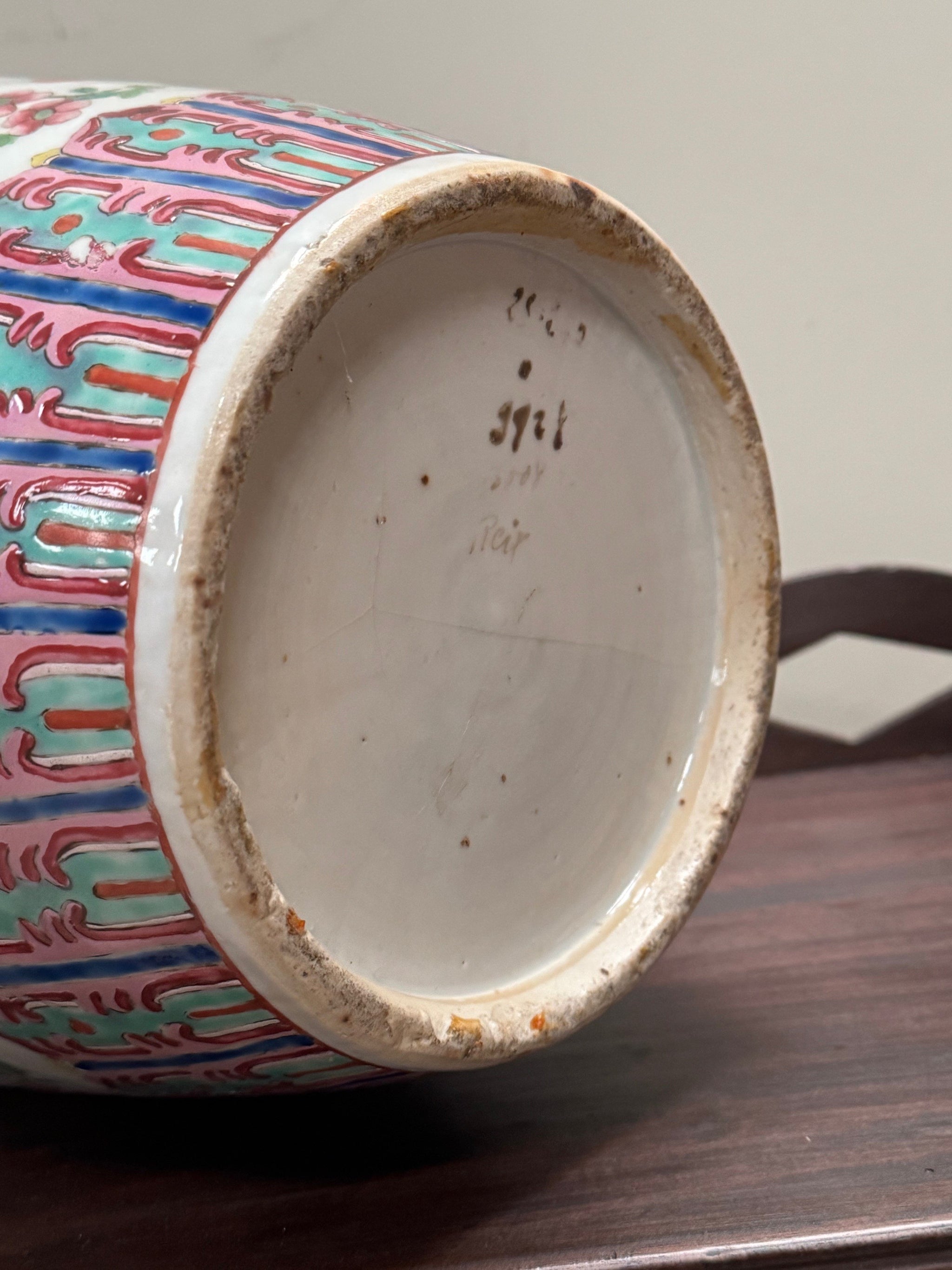 Beautiful soft green ceramic vase adorned with butterfly and floral painted decorations.