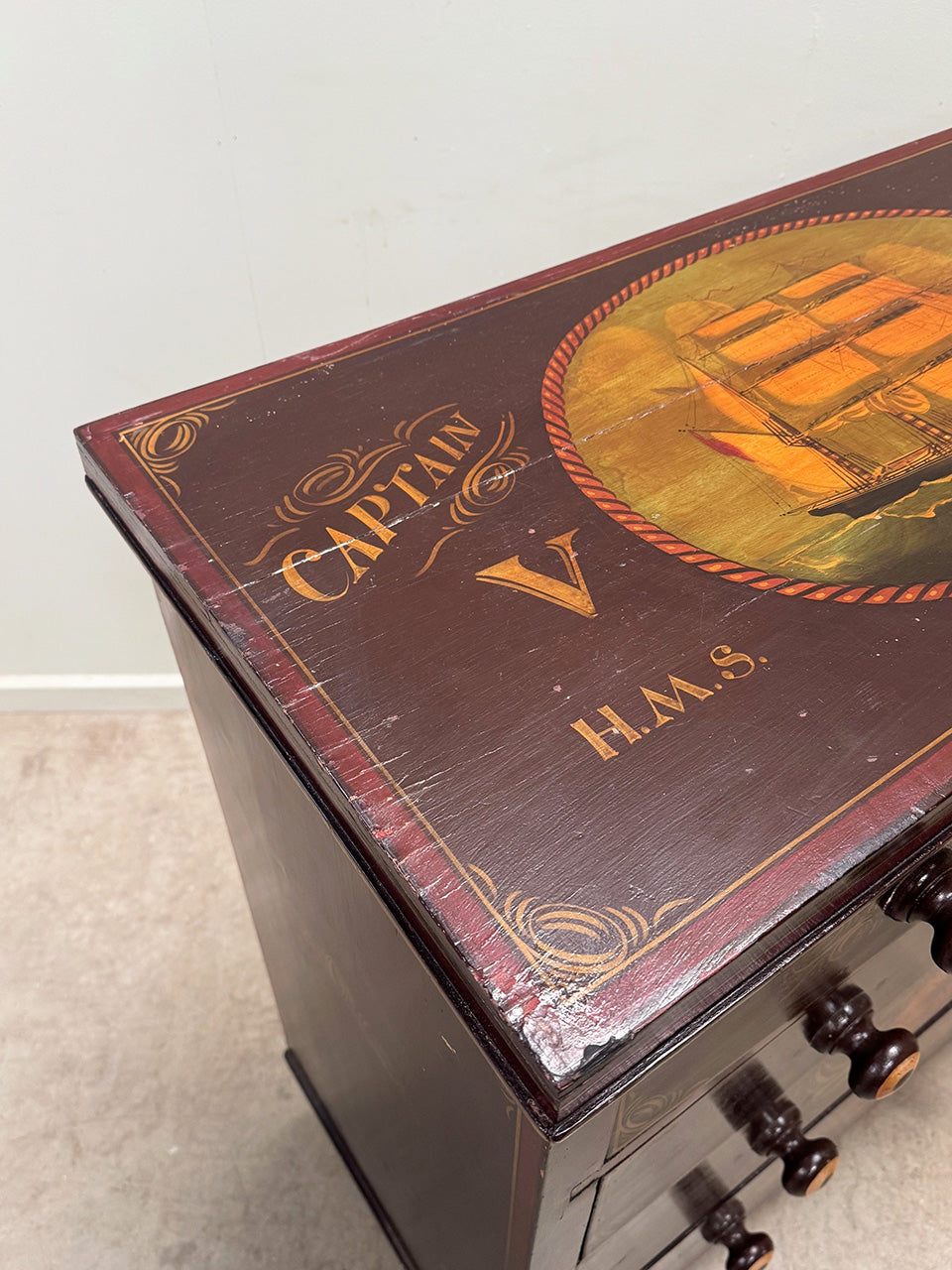 An early 1900s painted pine chest of drawers, seemingly dedicated to Captain P. More from the H.M.S Oak, as depicted on the top.