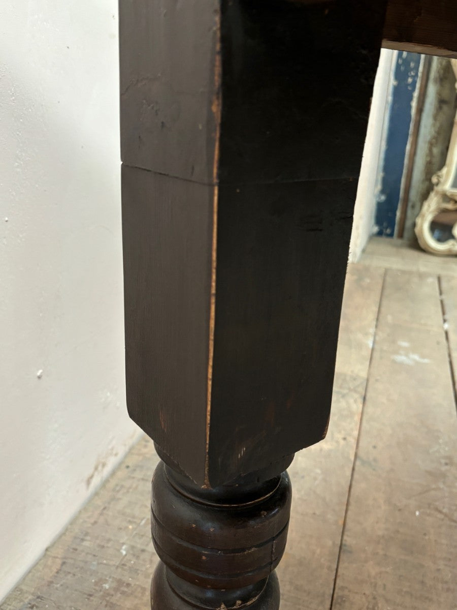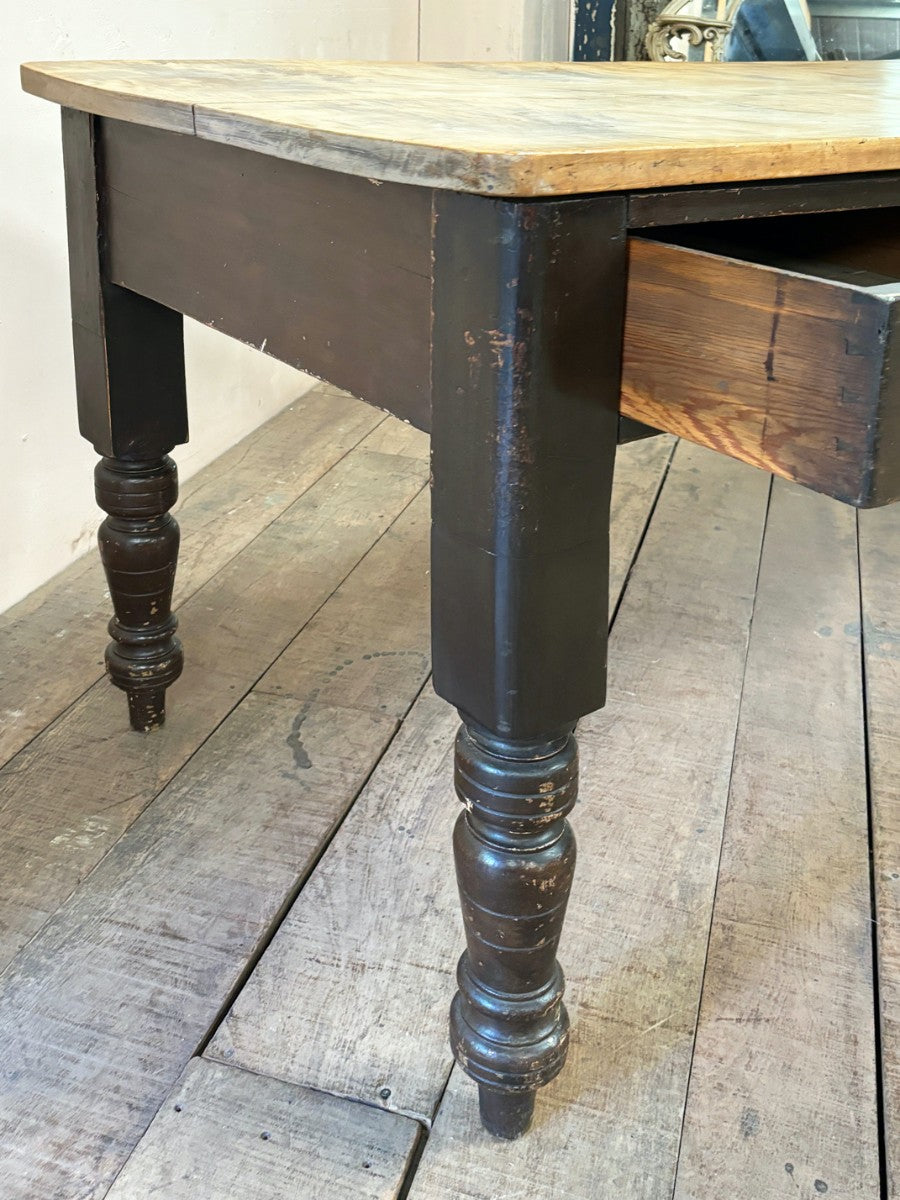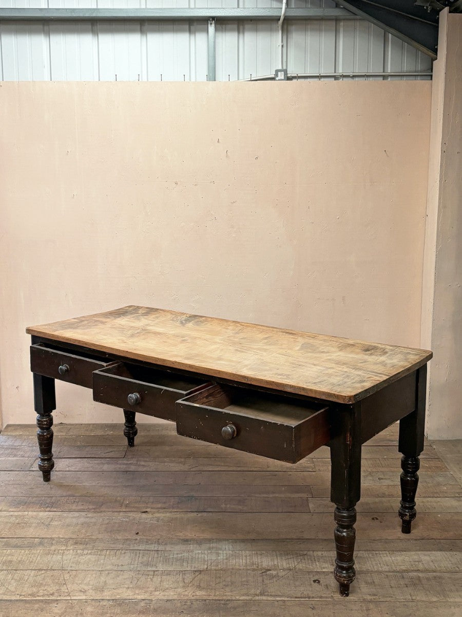Victorian 3 drawer Lancashire kitchen prep table with a thick, 2 plank sycamore top, which has in the past been (usefully) raised to kitchen counter height.