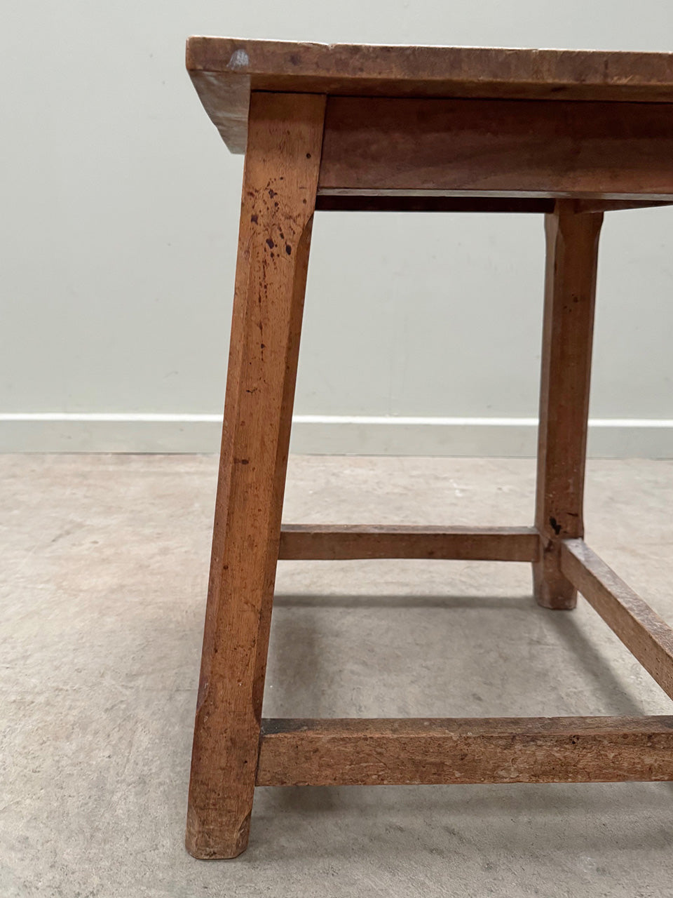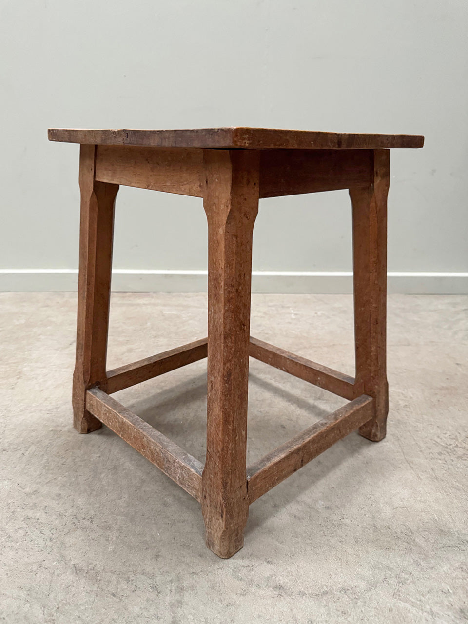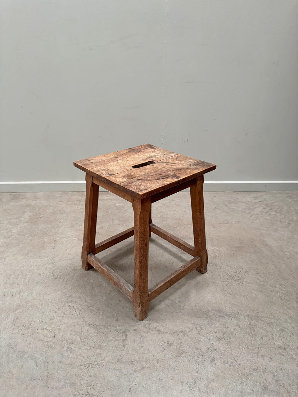 A sleek walnut A-frame stool with a hand hole and bevelled legs.
