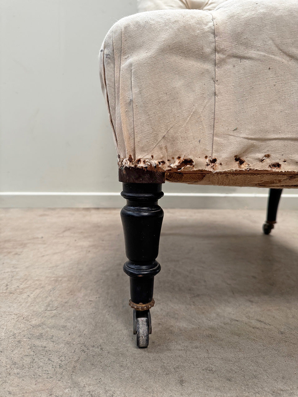 With turned ebonised legs on castors, and deep buttoning to the seat and back.