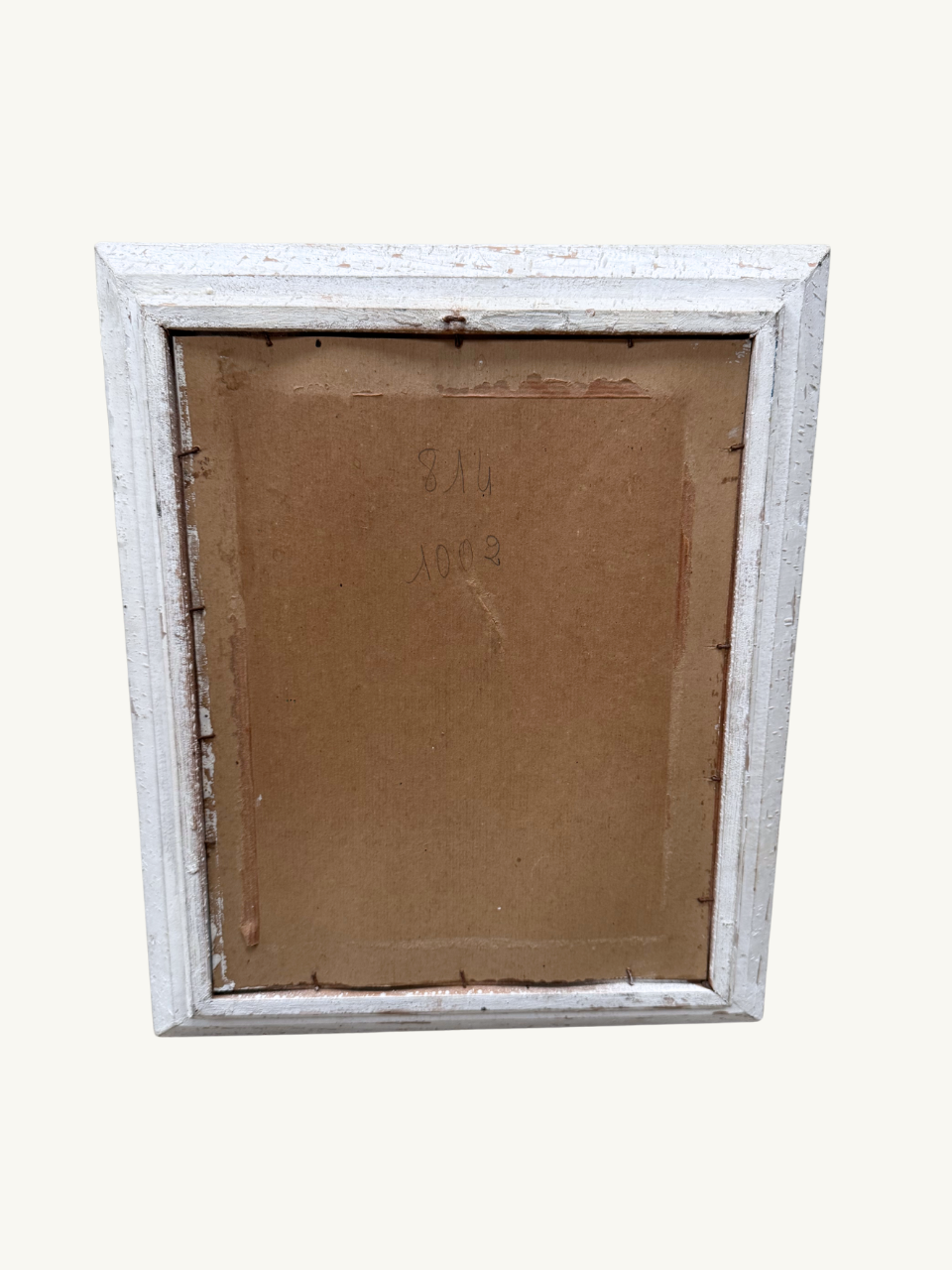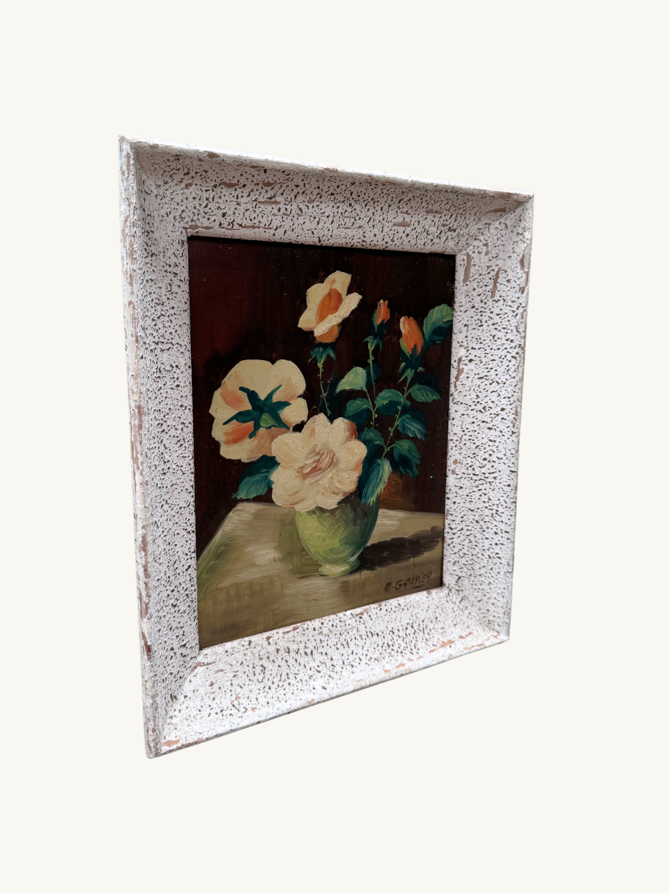 A 1960s painting of flowers in a vase, on thick paper set on a board. Signed by M. Gravier, a postmodern French artist. Set in a white, mottled, textured frame.