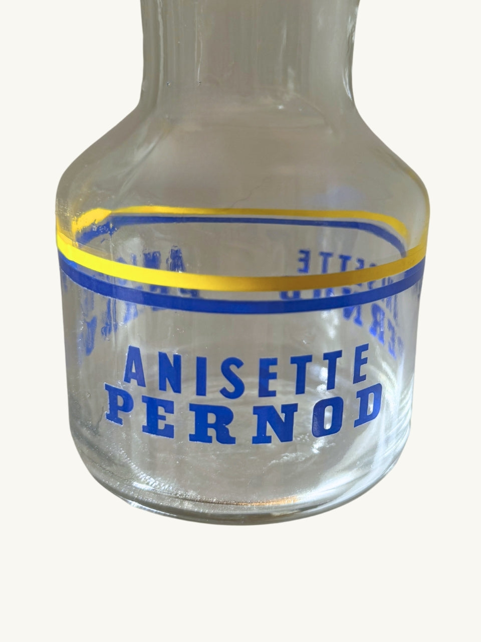 A Pernod Anisette glass water carafe, from the 1970s. These were commonly used in French bars and bistros to promote the Pernod anise liqueur, a popular apéritif base that is mixed with water. In great condition, no chips or cracks. Stamped 'Italy' on the base, suggesting it was manufactured in Italy.