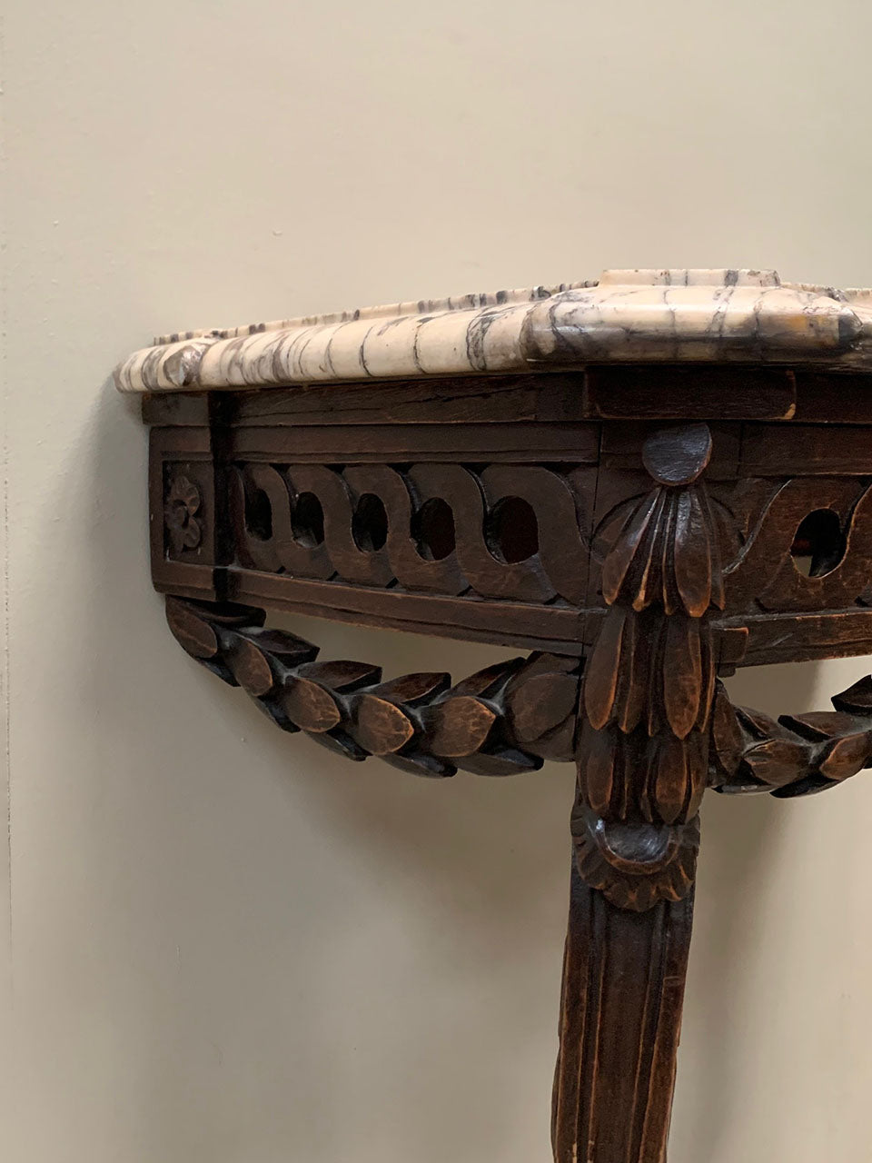 A pretty and small late 1800s white and grey marble top console table, from a chateau in the Loire Valley.
