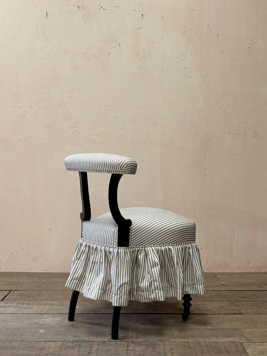 1860’s occasional chair restored and re-upholstered in a ‘Howe' brown striped ticking with ankle length skirt.
