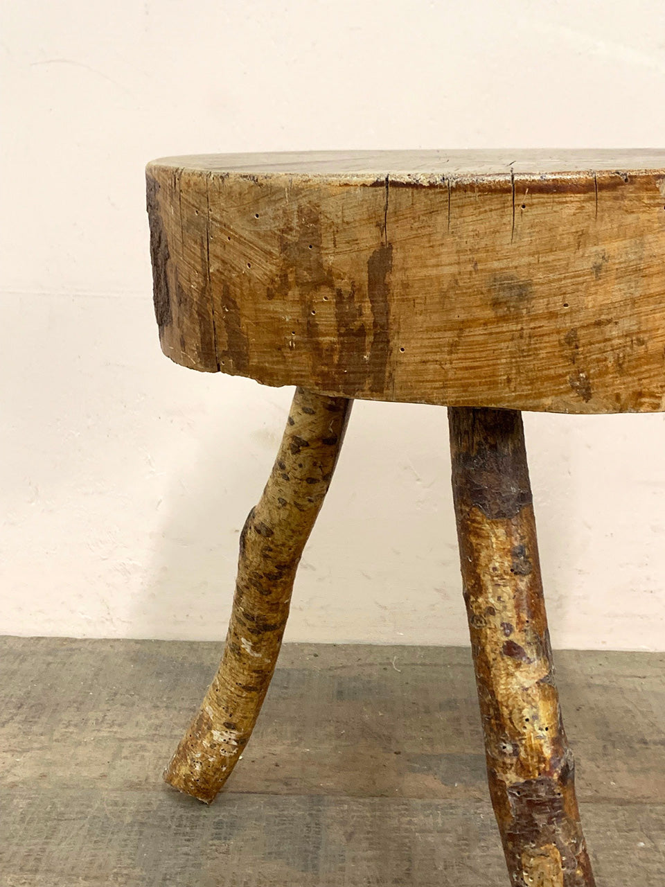 A rustic heavy oak top stool with a tripod base made of raw branches.