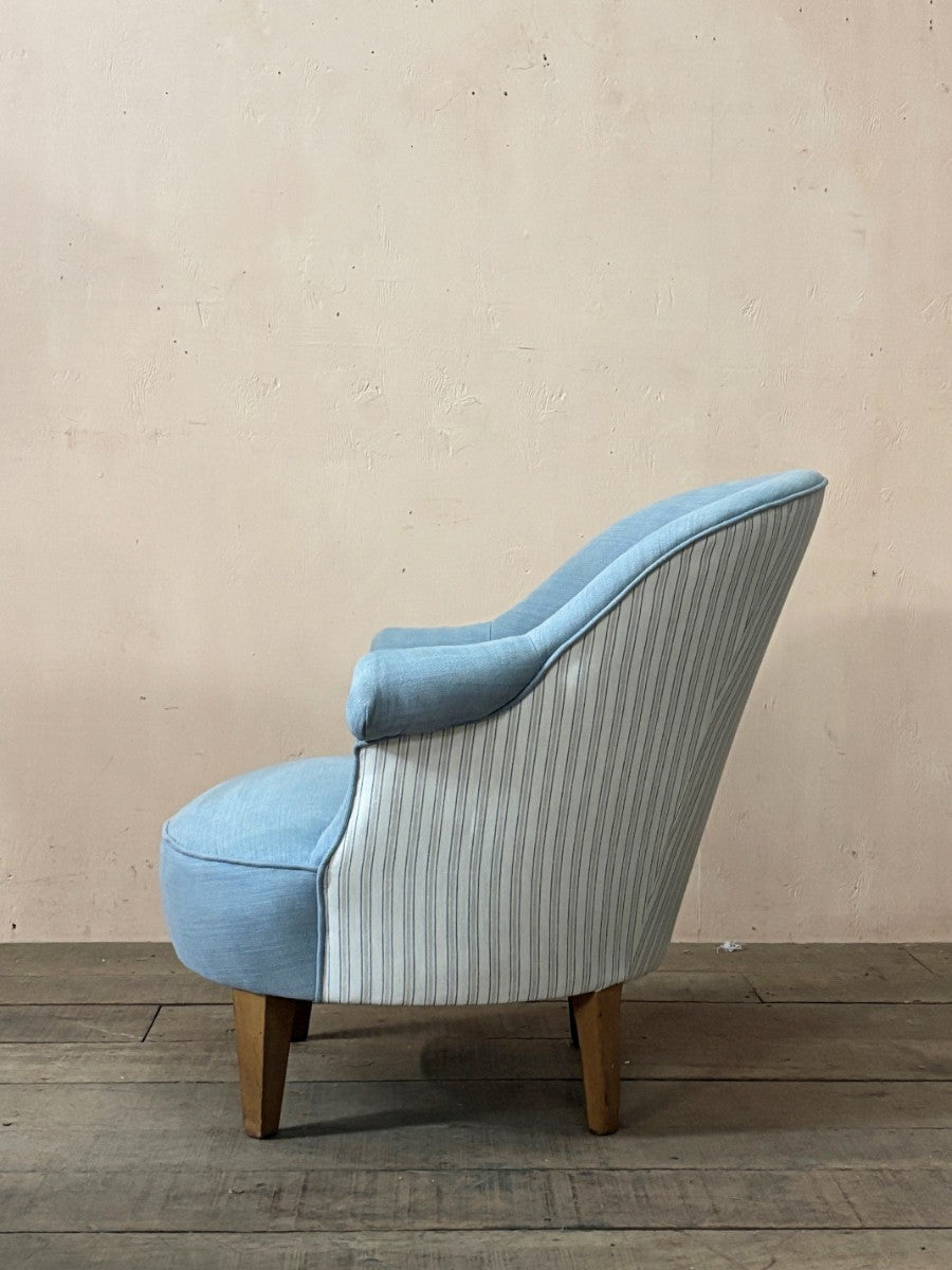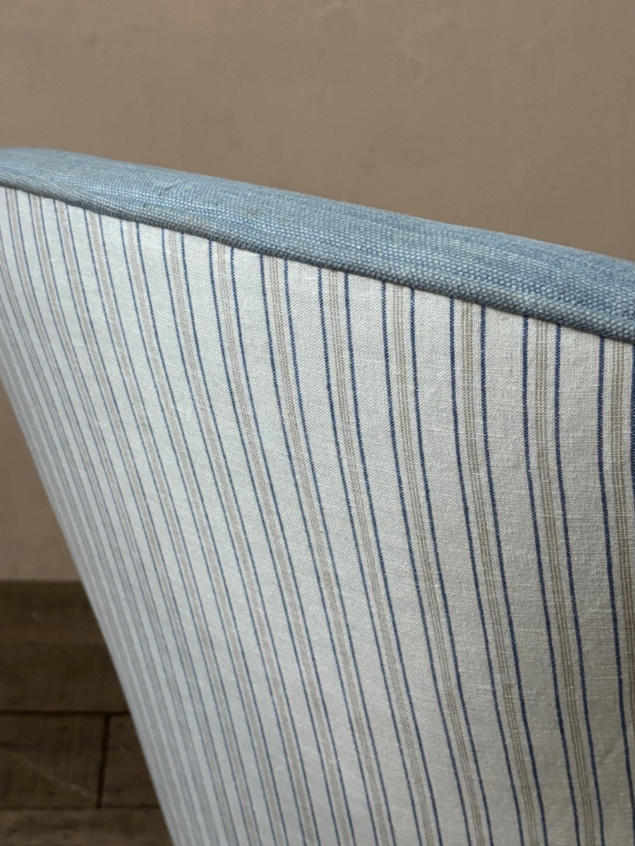 Early 20th century French tub armchair on square tapered legs, restored and upholstered in a heavy stonewashed due linen with striped ticked outside back.