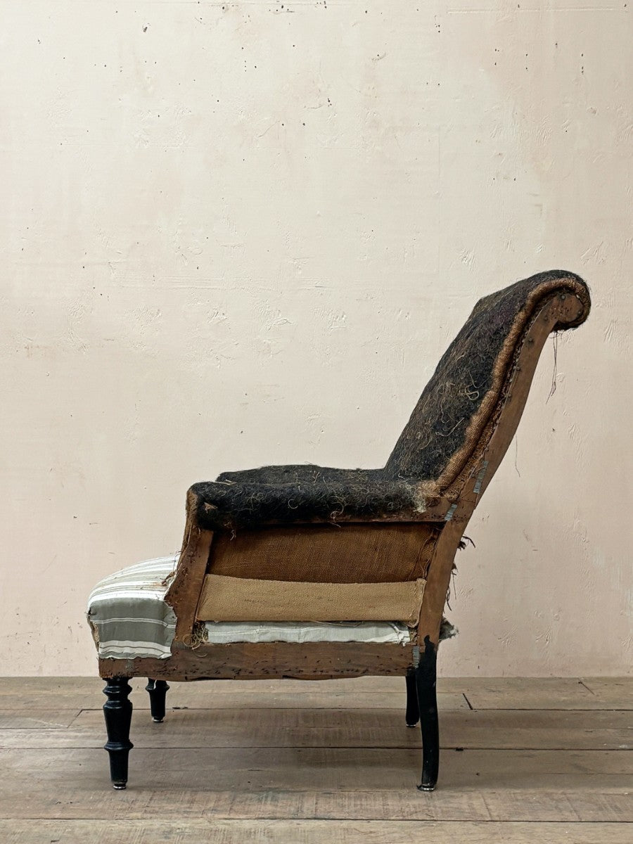 Stripped back to ticking seat and horsehair pad, ready for re-upholstery.