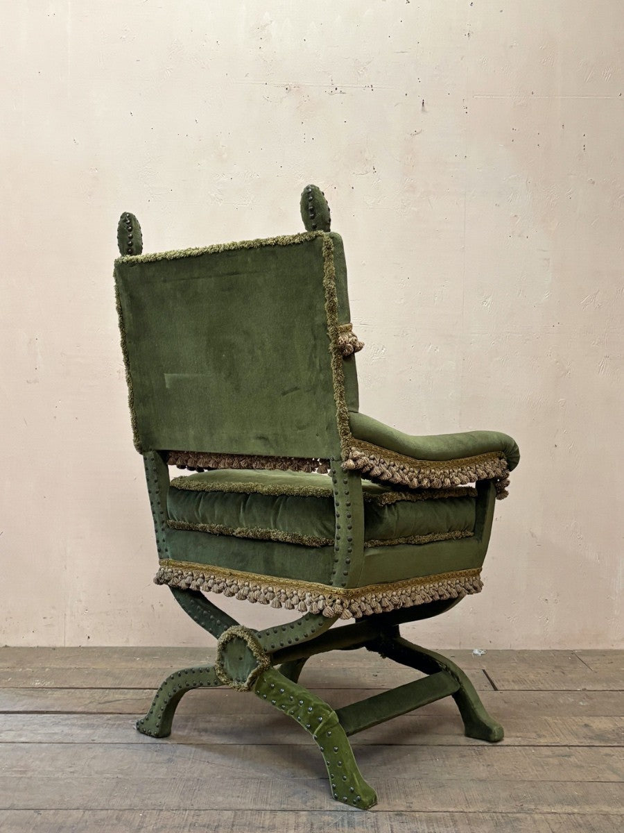 Early 20th century X base throne chair, retaining its original velvet and fringing and in excellent condition.