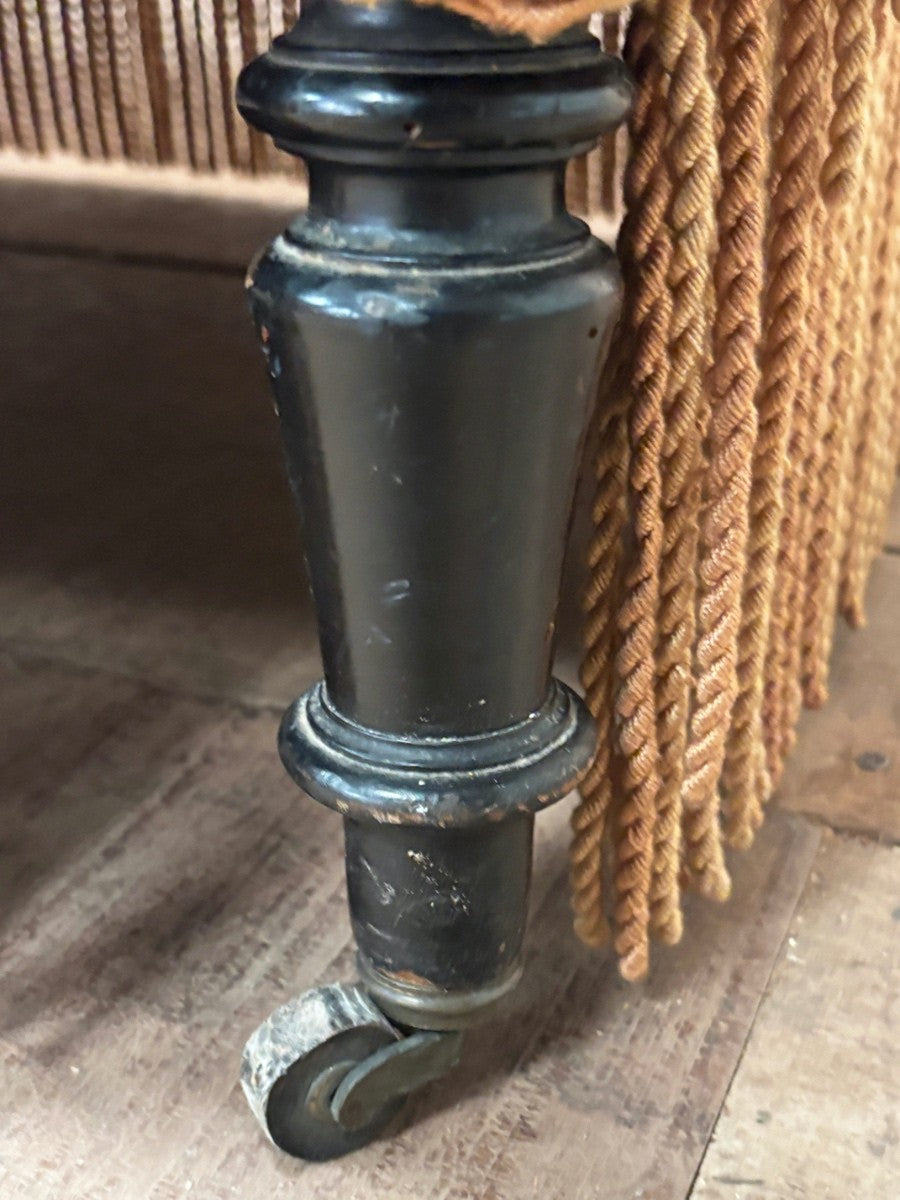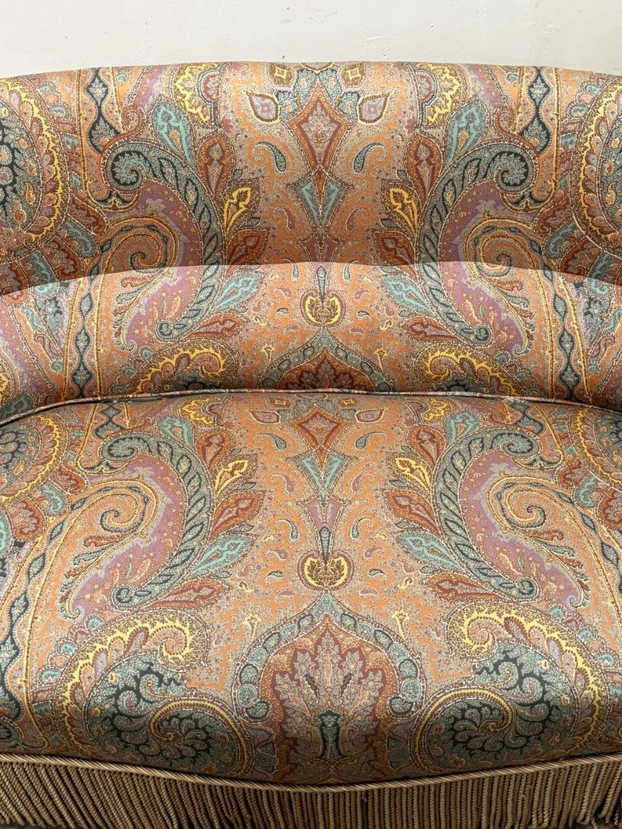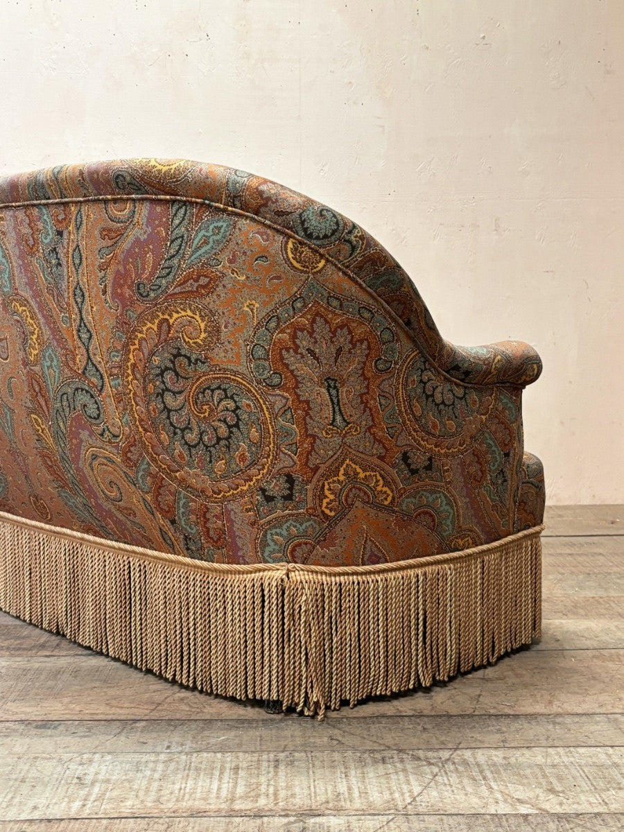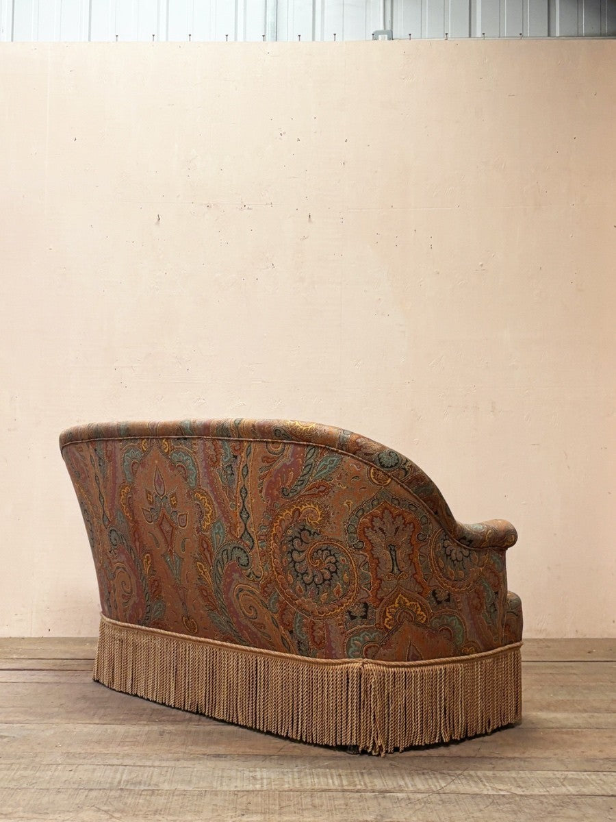 Mid 19th century curved back sofa in excellent condition retaining clean, paisley upholstery with fringed base.