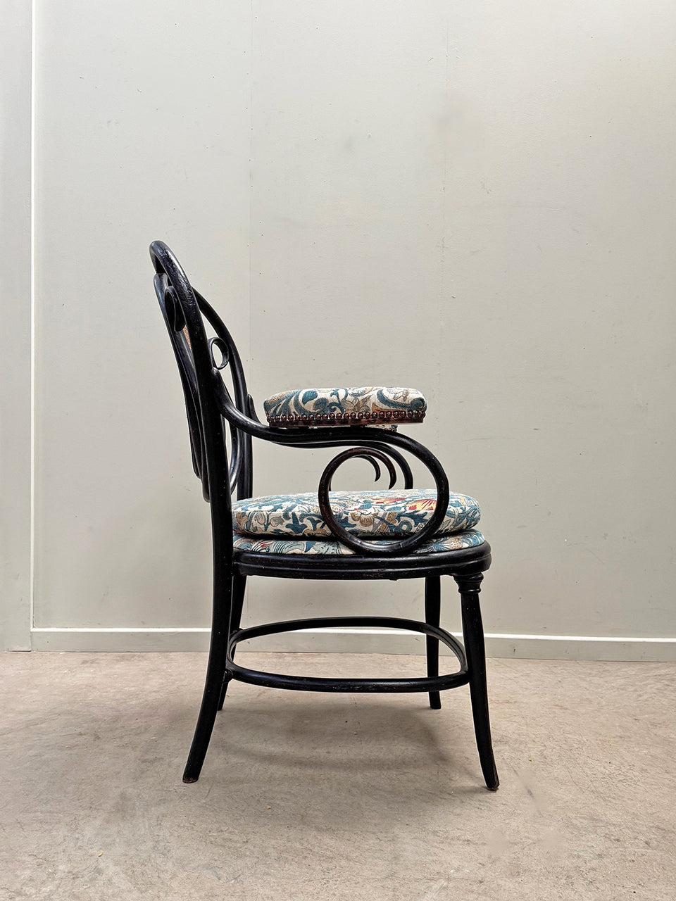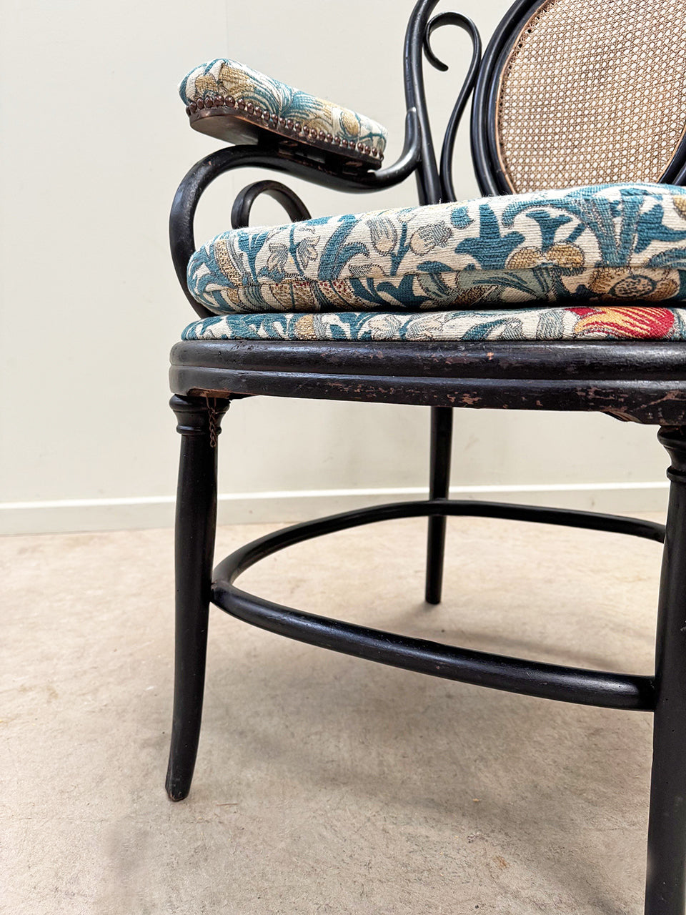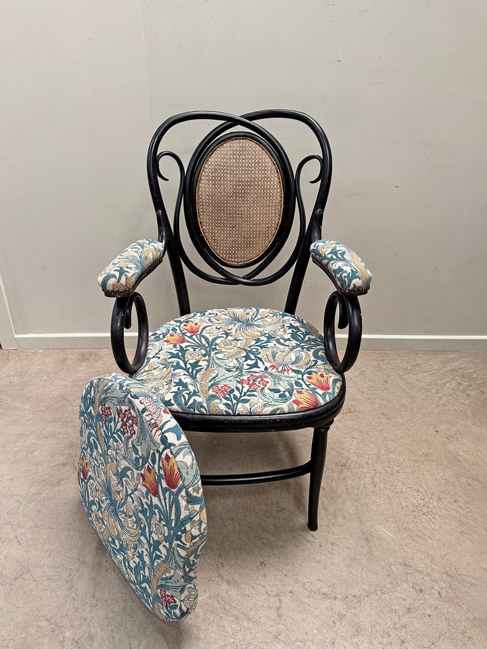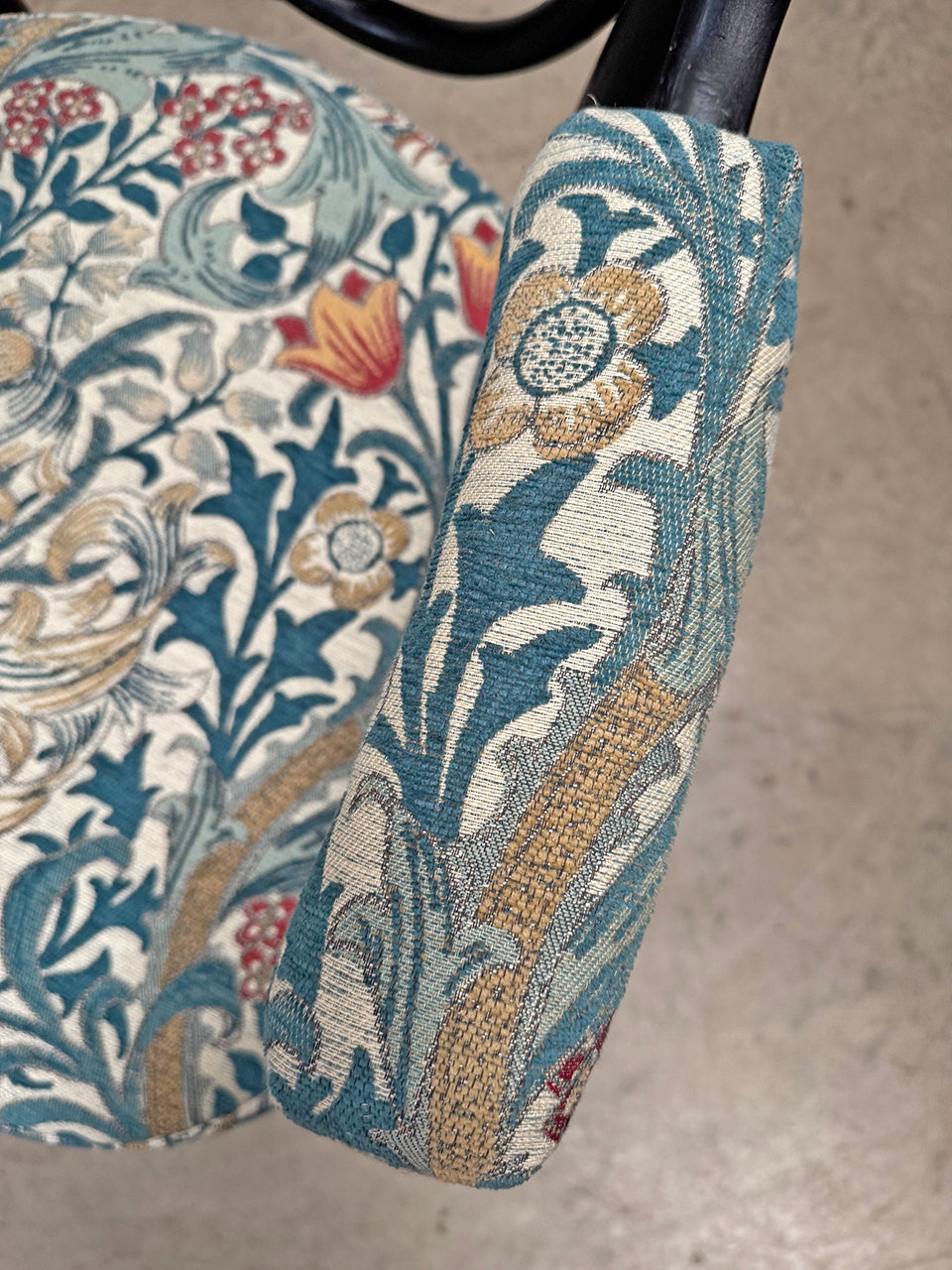 Recently reupholstered by us in 'Golden Lilly' woven fabric by William Morris, the chair has a new and loose seat cushion and padded armrests.