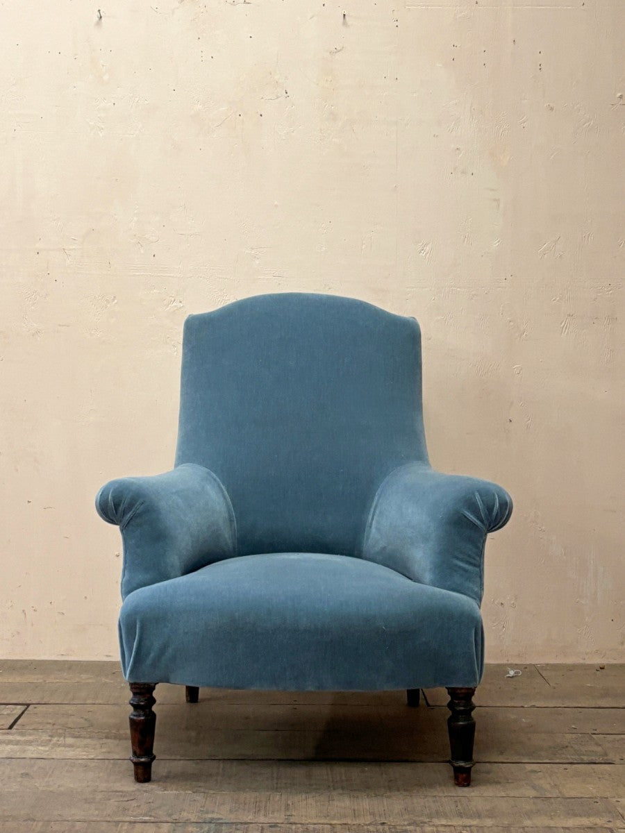 Mid 19th century armchair restored and re-upholstered in good quality 'French Blue’ mohair velvet.