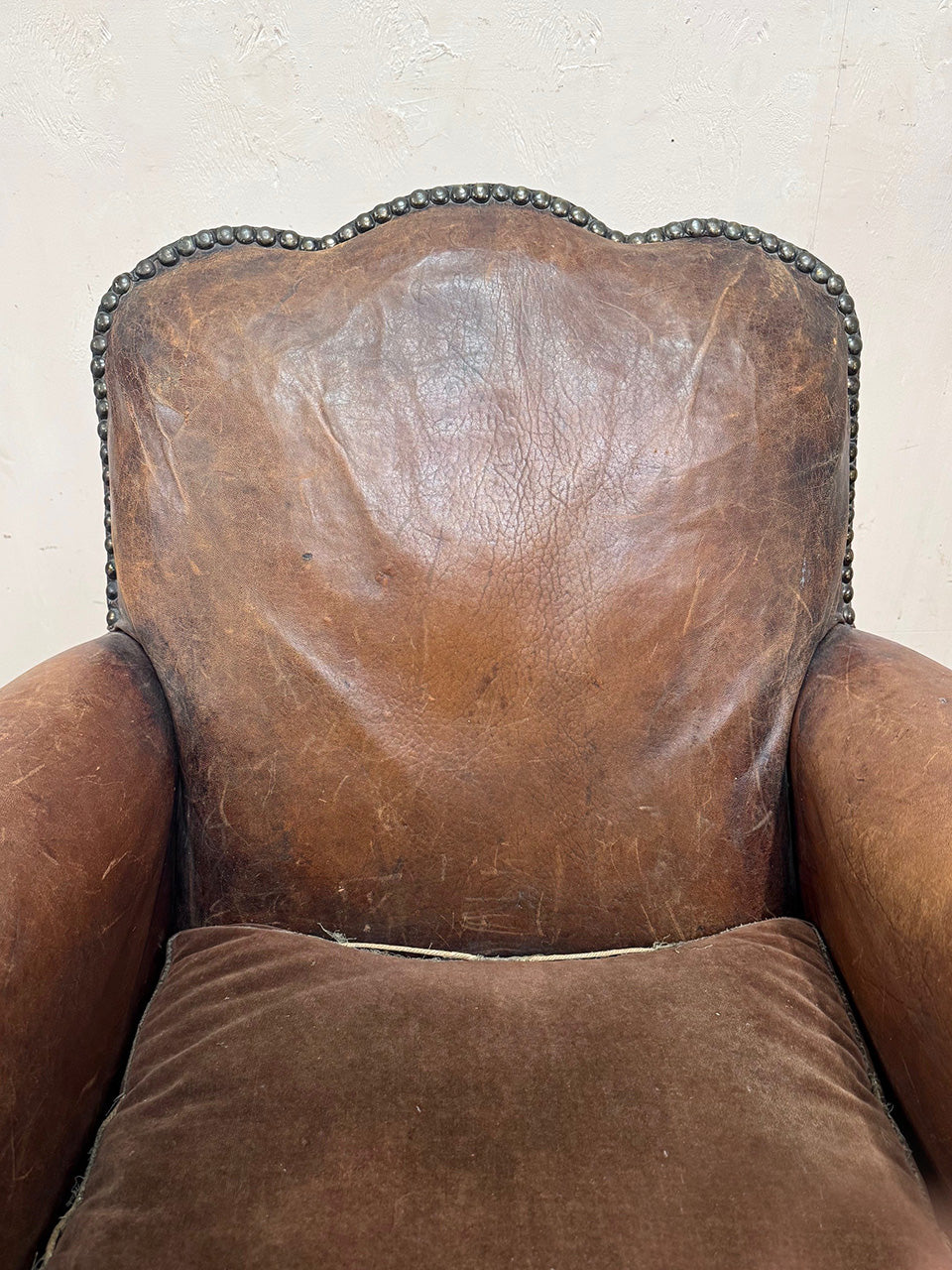 A near 'his and her' pair of leather studded armchairs with loose velvet seat cushions.