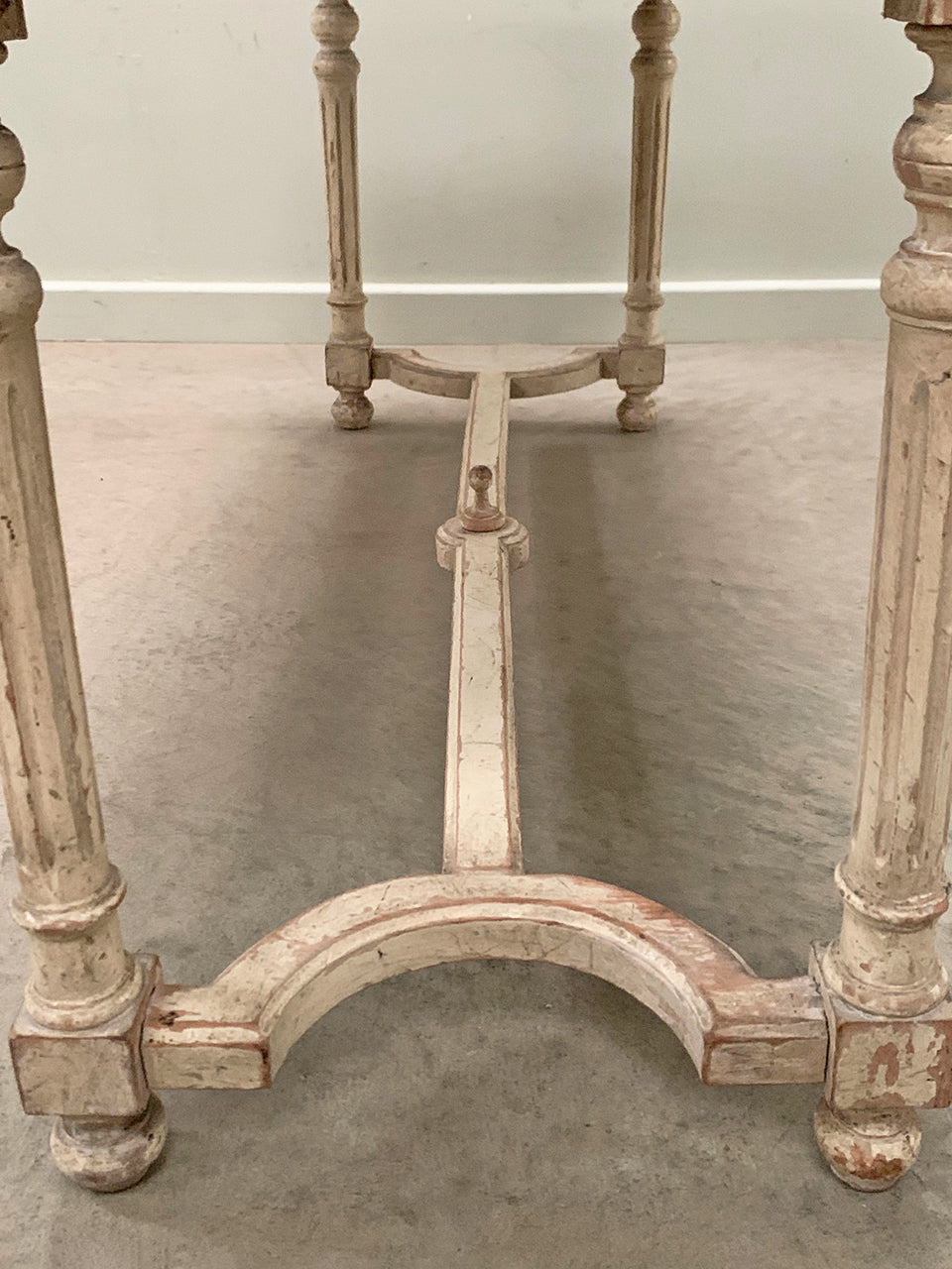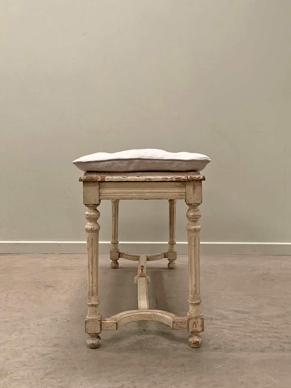 Louis XVI style cream painted bench with fluted legs and curved stretchers.