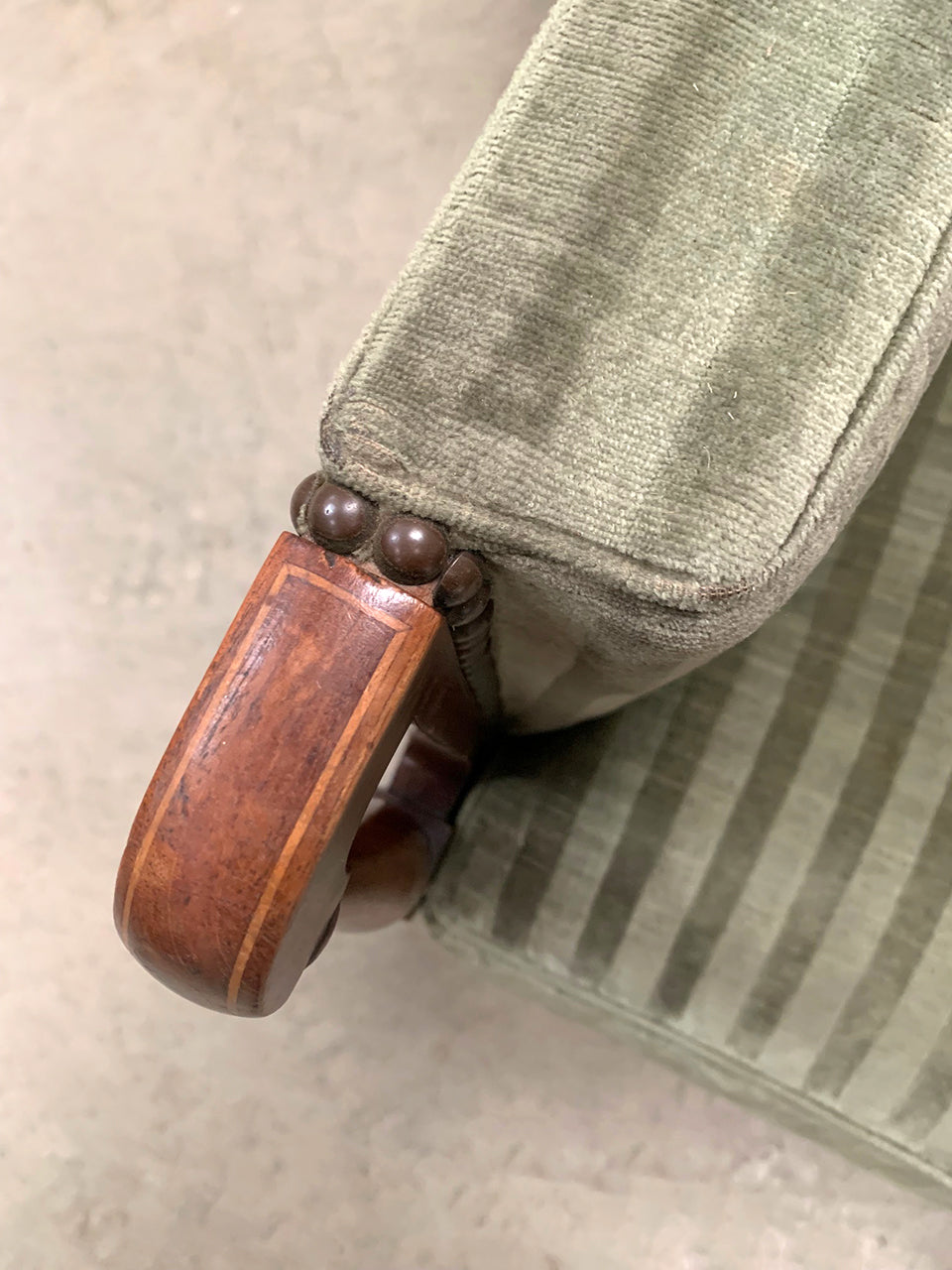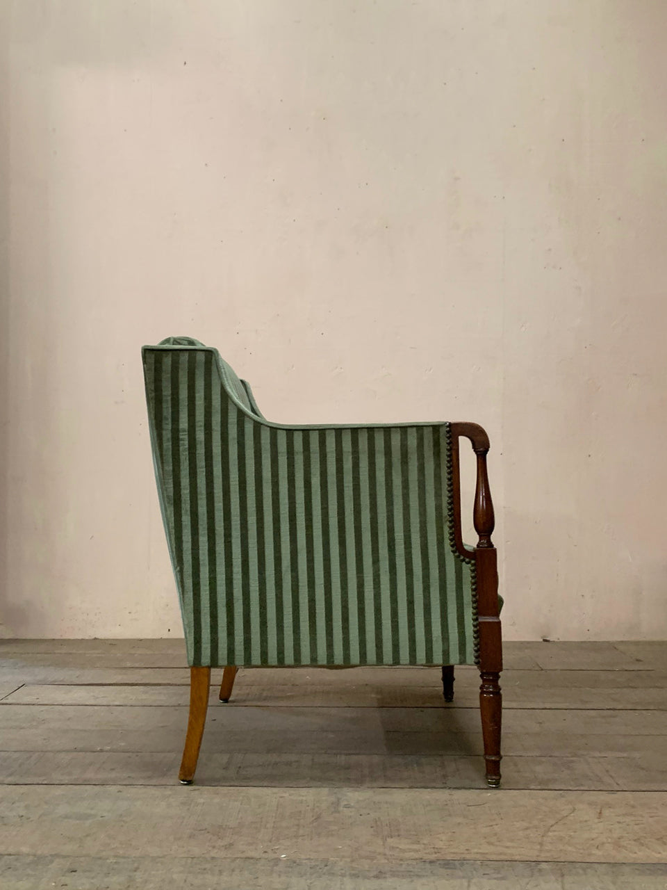 1930's pair of square sided armchairs covered in a green striped velvet style fabric.