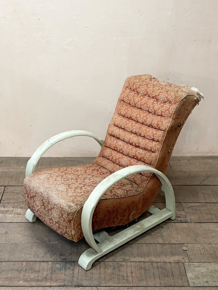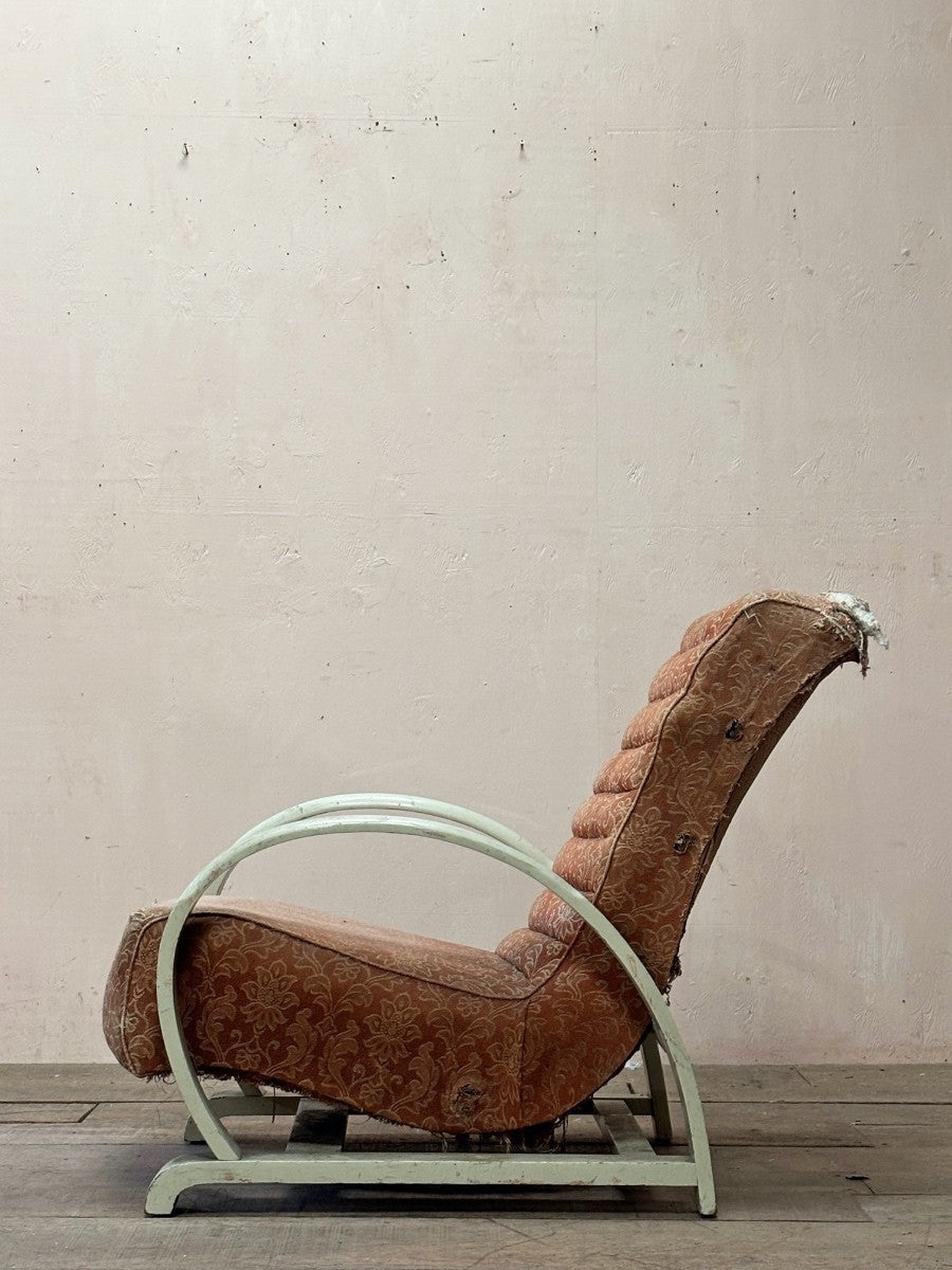Pair of 1930-40’s armchairs with looped, bentwood arms on a stretcher base, retaining their original paint and for re-upholstery.