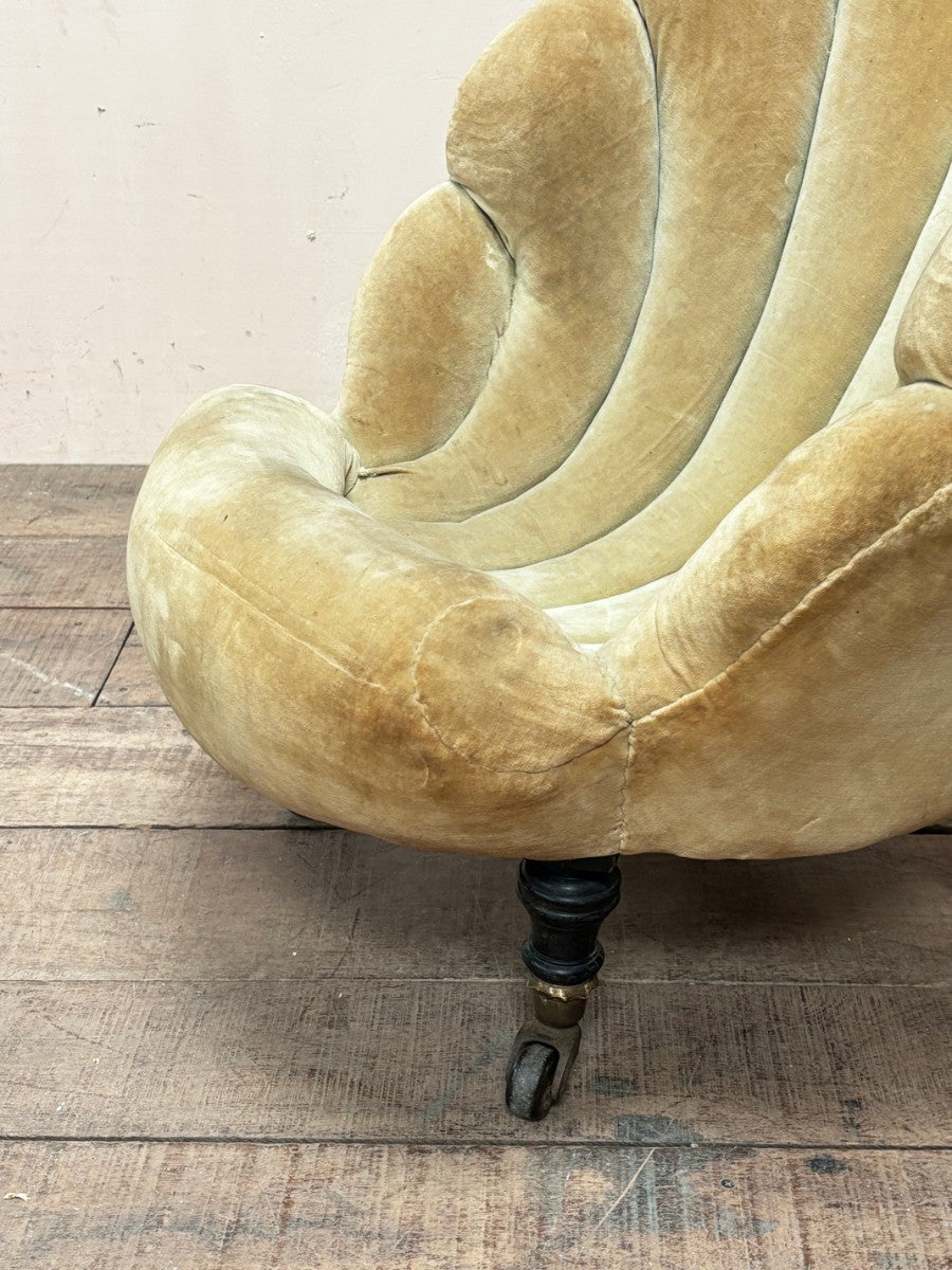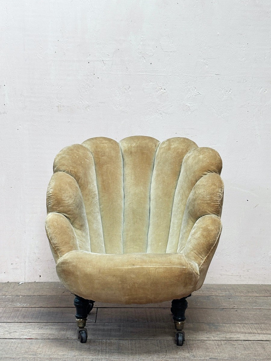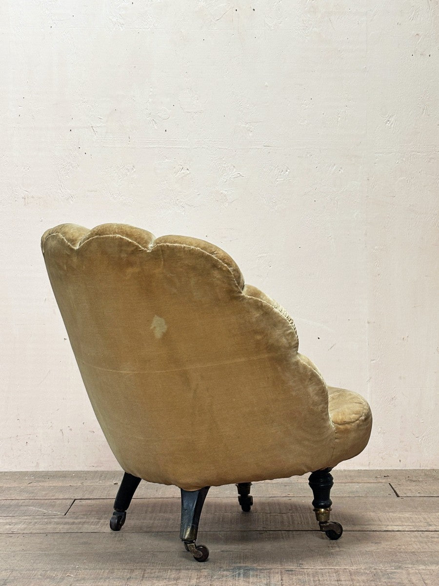 Very hard to find pair of shell chairs by Hampton and Sons, standing on ebonised legs with brass and porcelain castors in old, soft, faded mustard velvet.