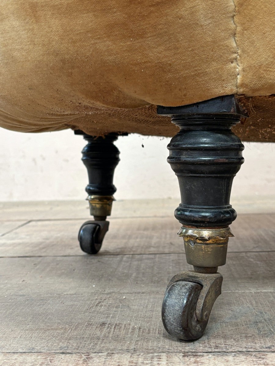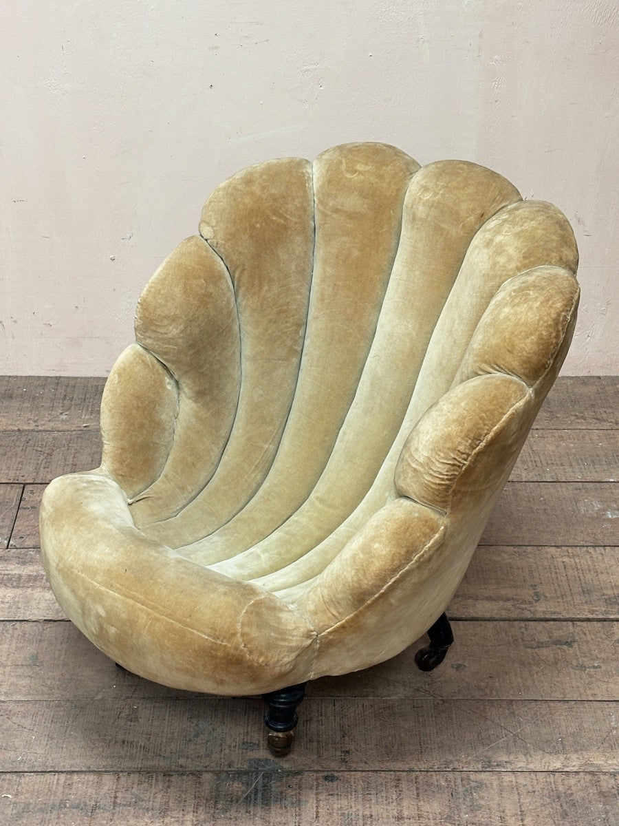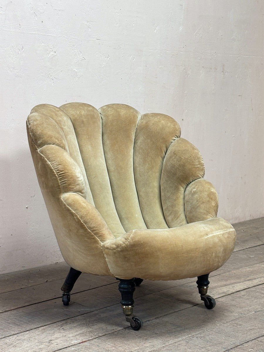 Very hard to find pair of shell chairs by Hampton and Sons, standing on ebonised legs with brass and porcelain castors in old, soft, faded mustard velvet.
