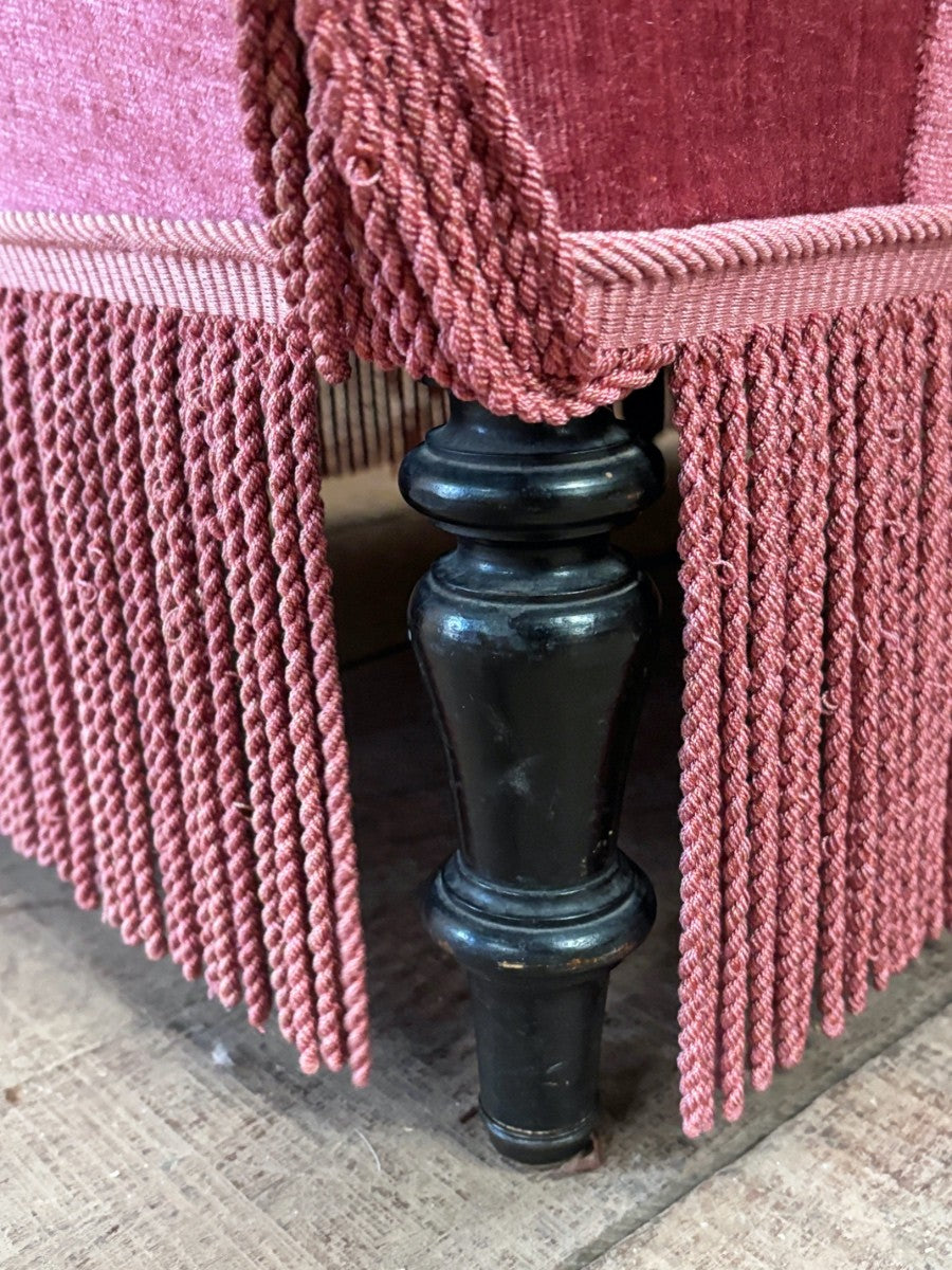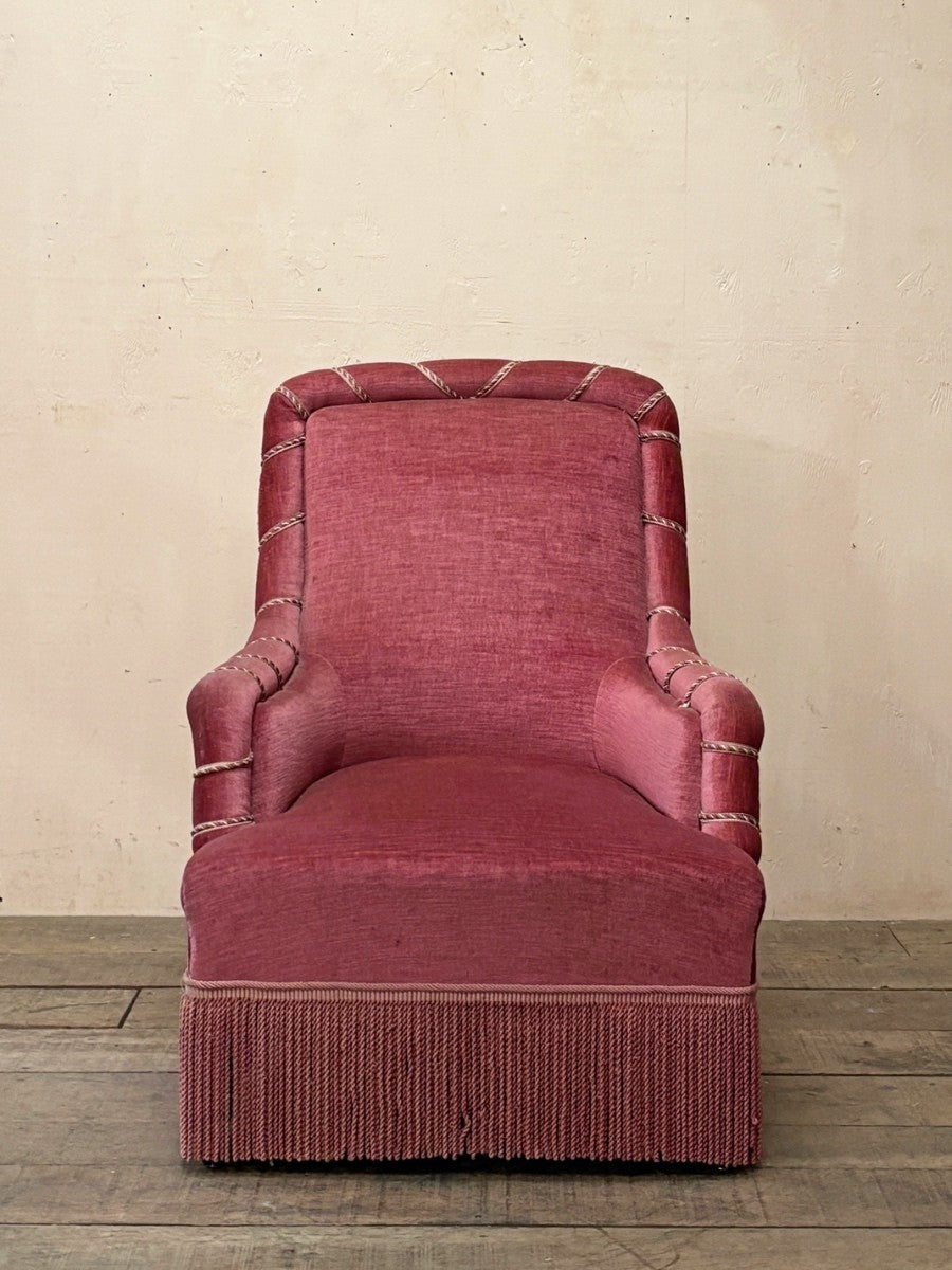 Hard to find 19th century armchair with rolled edge, retaining its clean, pink velour upholstery and fringed skirt.