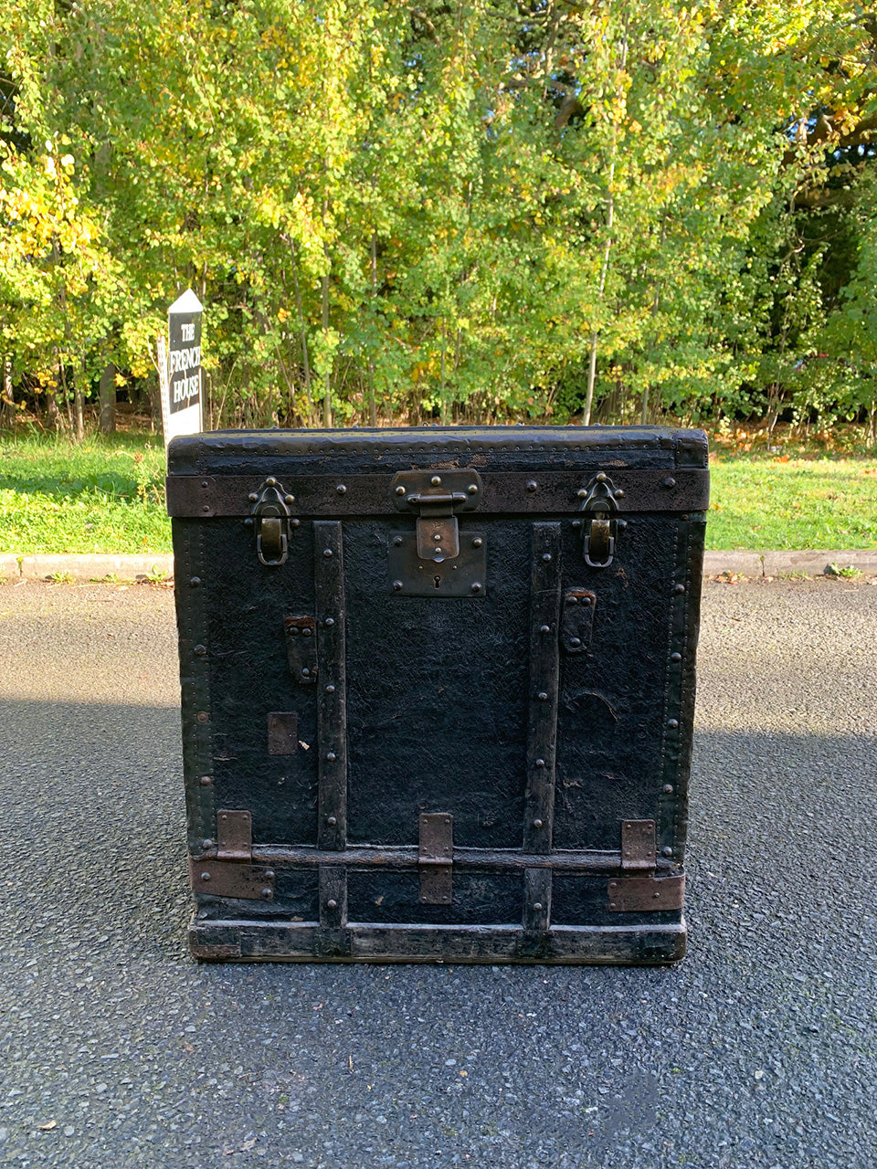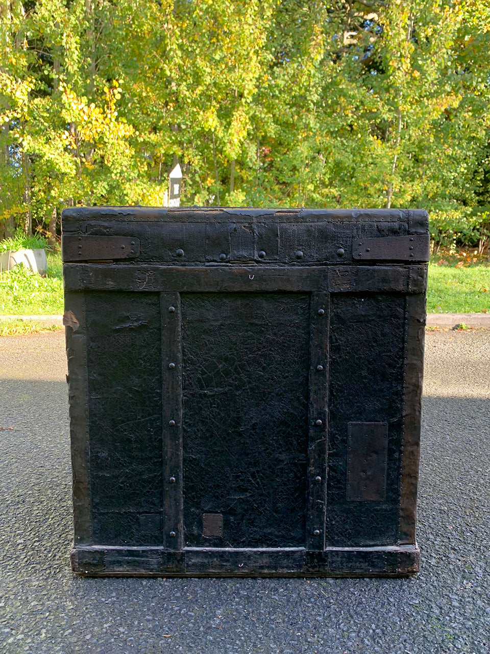 Wooden box lined in thin black leather with metal supporting straps and hardware and decorated with brass studs.